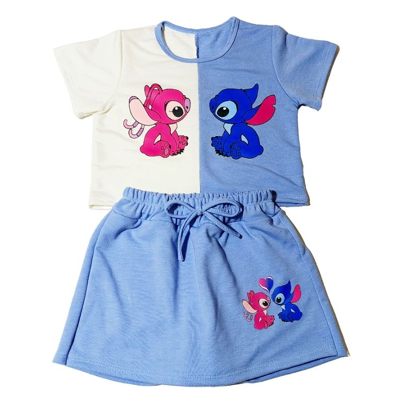 Conjunto Infantil Menina Stitch e Angel – Blusa Bicolor + Short Saia – Dupla Estampa Divertida