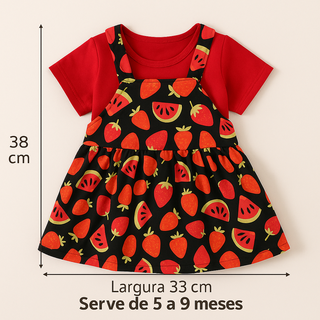 ⭐ Destaques Look confortável para dias quentes Estampa divertida que encanta em fotos Material leve e respirável para bebês Perfeito para festinhas, passeio e presente ⭐ Conteúdo da embalagem 1 jardineira 1 blusinha Embalado para presente ⭐ Tamanhos / Idades Serve de 5 a 9 meses Medidas reais nas fotos ⭐ Garantia Troca fácil Envio rápido