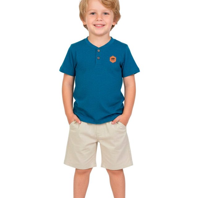 Conjunto Infantil Menino Camiseta em Meia Malha Relevo e Bermuda em Sarja - - Pensada para acompanhar cada momento ativo dos pequenos nos dias de calor. Confeccionada em malha, com composição Camiseta 100% Algodão Bermuda 97% Algodão, 3% Elastano, 98% Algodão, 2% Elastano, traz toque macio e confortável. Ideal para brincar, passear e curtir o clima quente com conforto. Um aliado do dia a dia, oferecendo frescor e cuidado para as crianças. Características Gerais do Produto: Acompanha o produto: • 1 Camiseta e 1 Bermuda
