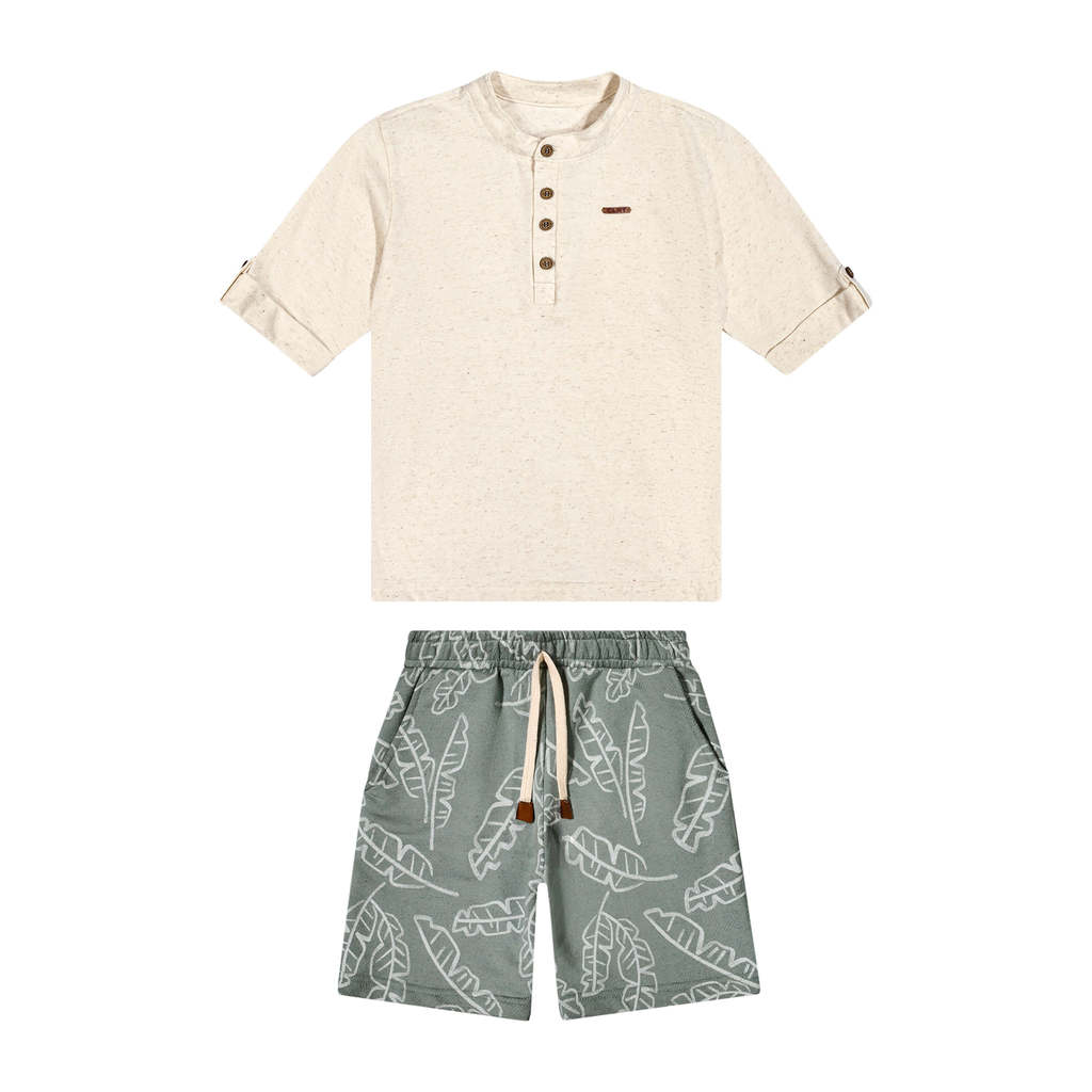 O Conjunto Colorittá é composto por camisa em malha linho e bermuda em moletom eco linho estampado. A camisa possui mangas 3/4 com detalhe dobrado, gola padre e abertura em botões no peitilho, trazendo um toque elegante ao look. Já a bermuda conta com elástico no cós, bolsos laterais e estampa de folhagens, que transmite a leveza da estação. Ideal para passeios descontraídos ou eventos especiais, esse conjunto combina conforto e atitude. Aposte!Detalhes da peça: • Conjunto composto por camisa e bermuda • Feito em malha linho e moletom eco linho estampado • Possui gola padre com botões no peitilho • Possui mangas 3/4 • Elástico no cós • Possui bolsos • Estampa tropical com folhas • Ideal para passeios descontraídos ou eventos especiais
