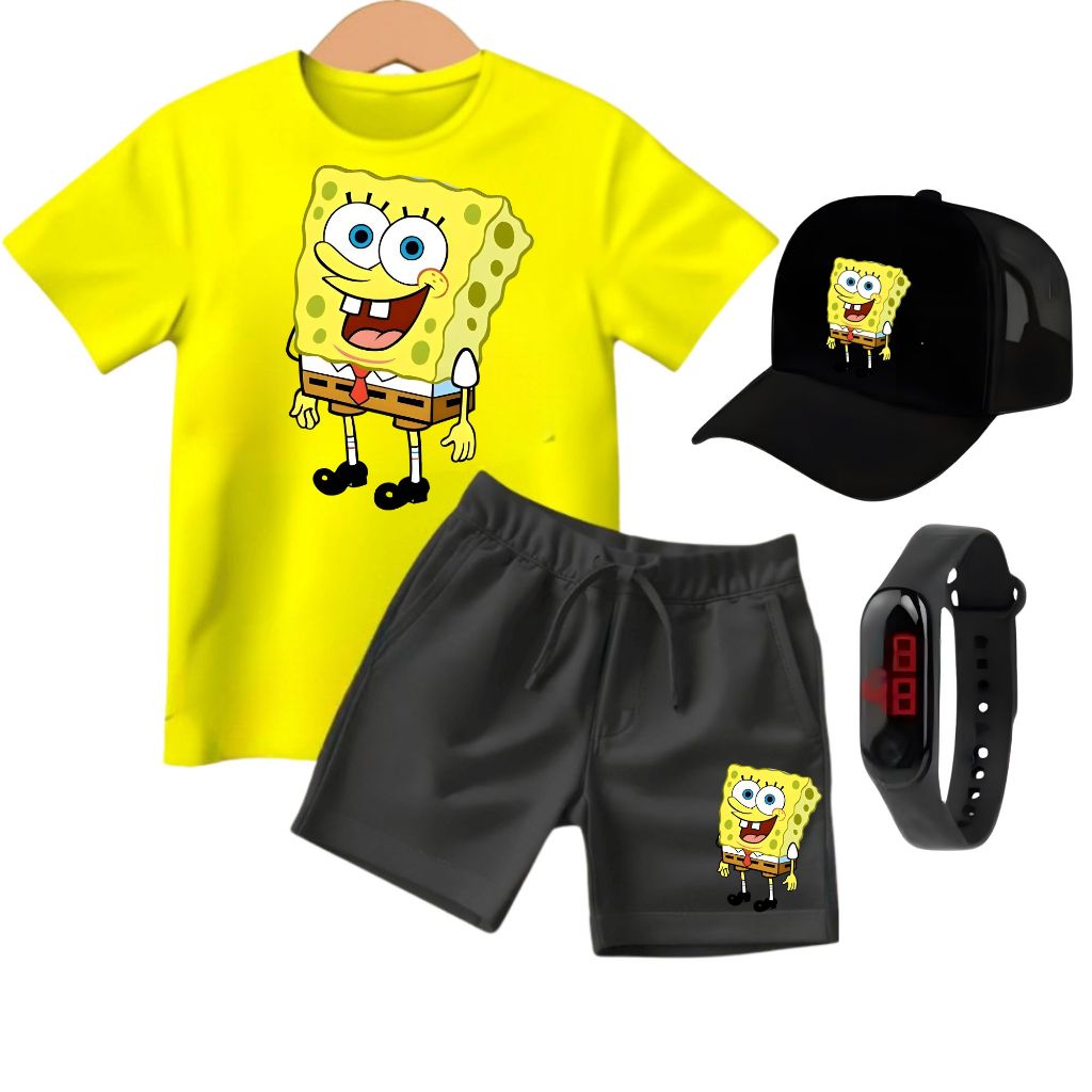 Conjunto Infantil Meninos Camiseta Short Relogio Boné Bob Esponja