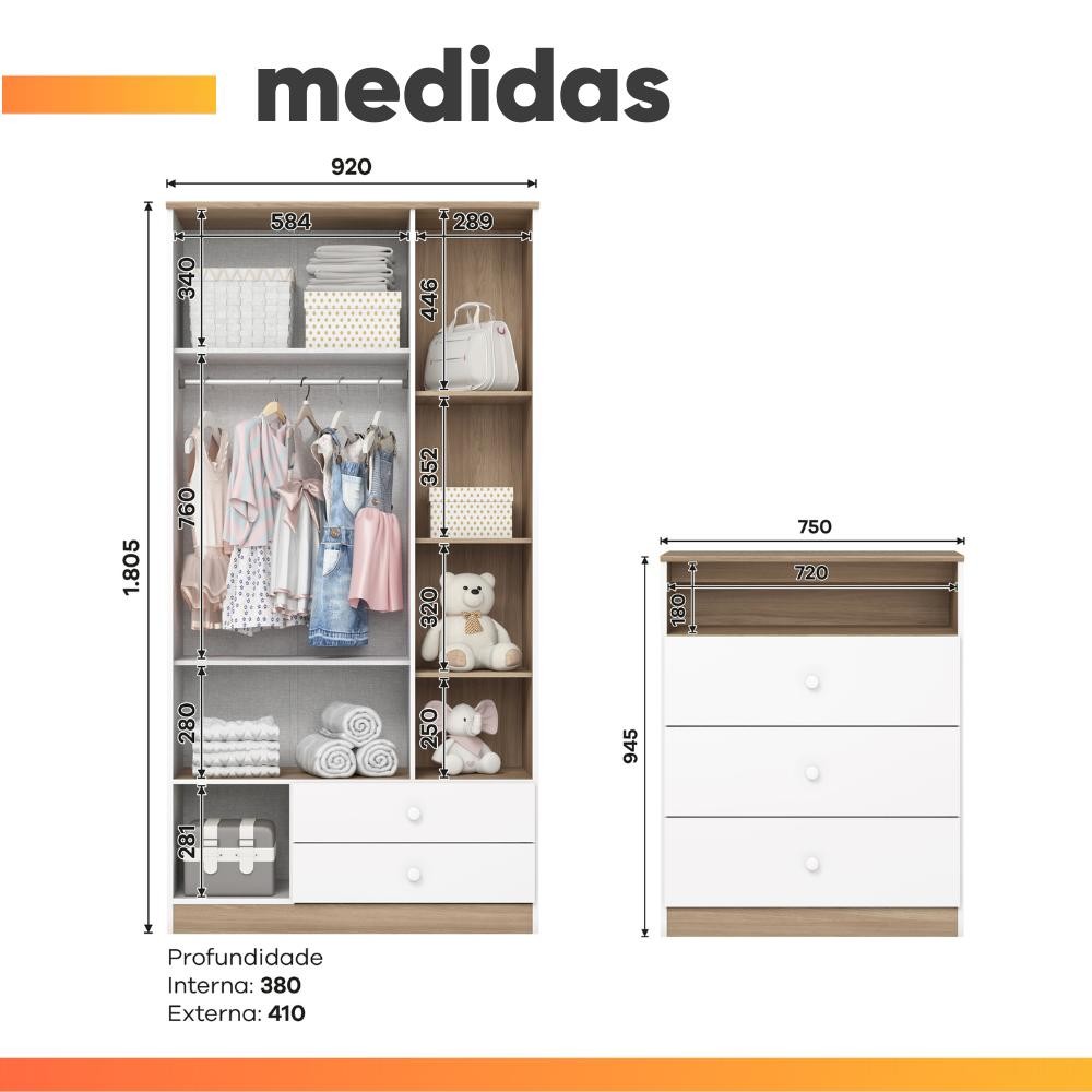O Conjunto Infantil Magia foi desenvolvido para oferecer praticidade, segurança e aconchego no dia a dia do bebê. O conjunto é composto por guarda roupa e cômoda garantindo organização, conforto e versatilidade para o quarto. O guarda-roupa conta com cabideiro reforçado, prateleiras bem distribuídas e gavetas com corrediças telescópicas, proporcionando amplo espaço para roupas, acessórios e brinquedos. A cômoda traz 3 gavetas espaçosas com corrediças telescópicas e um nicho aberto para decoração ou itens de uso diário, unindo praticidade e estilo. Produzido em material de alta qualidade e acabamento resistente, o Conjunto Infantil Magia é a escolha ideal para criar um ambiente organizado, funcional e acolhedor. MEDIDAS: MEDIDAS DA CÔMODA: A = 95 cm L = 75 cm P = 40 cm MEDIDA DO GUARDA ROUPAS: A = 180 cm L = 92 cm P = 41 cm PESO GUARDA ROUPA: 53 kg PESO CÔMODA: 27 kg CÔMODA SUPORTA ATÉ: 20 kg GUARDA ROUPA SUPORTA ATÉ: 90 kg PRATELEIRAS SUPORTAM ATÉ: 8 Kg CABIDEIRO SUPORTA ATÉ: 8 kg TAMPO DA CÔMODA SUPORTA ATÉ: 10 kg GAVETAS SUPORTAM ATÉ: 3 Kg MODELO: Conjunto Infantil Para Quarto Bebê Magia MARCA: Henn ACABAMENTO: Pintura UV Texturizada PINTURA: Atóxica MATERIAL DA ESTRUTURA: MDP/MDF PORTAS: 3 TIPO DE PORTAS: Bater DOBRADIÇAS: Metálicas GAVETAS: 5 CORREDIÇAS: Telescópicas PRATELEIRAS: 5 CABIDEIRO: Alumínio PUXADORES: 7 MATERIAL DOS PUXADORES: ABS ITENS INCLUSOS: 1 Guarda Roupa, 1 Cômoda, 1 Manual de montagem, 1 Kit Parafusos GARANTIA: 3 Meses Pelo Fabricante LIMPEZA: Para limpeza de seu móvel, use uma flanela limpa e seca. Não utilize produtos químicos que possam danificar o produto. Importante sobre a entrega: A entrega é realizada até a portaria ou porta de entrada do endereço indicado, desde que o acesso seja permitido. Para locais com portaria, a entrega será feita no piso térreo. Não realizamos montagem, desmontagem, transporte por escadas ou içamento. É responsabilidade do cliente verificar se as dimensões do produto são compatíveis com portas, elevadores e corredores. Evite imprevistos: confira todos os detalhes antes de concluir sua compra.