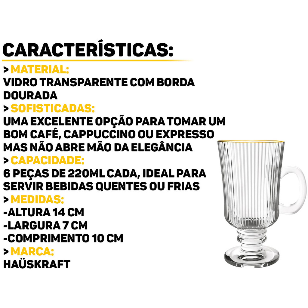 Conjunto Irish Canecas Em Vidro Bordas Douradas Para Cafés Chocolate Quente Chás 6 Peças 220ml