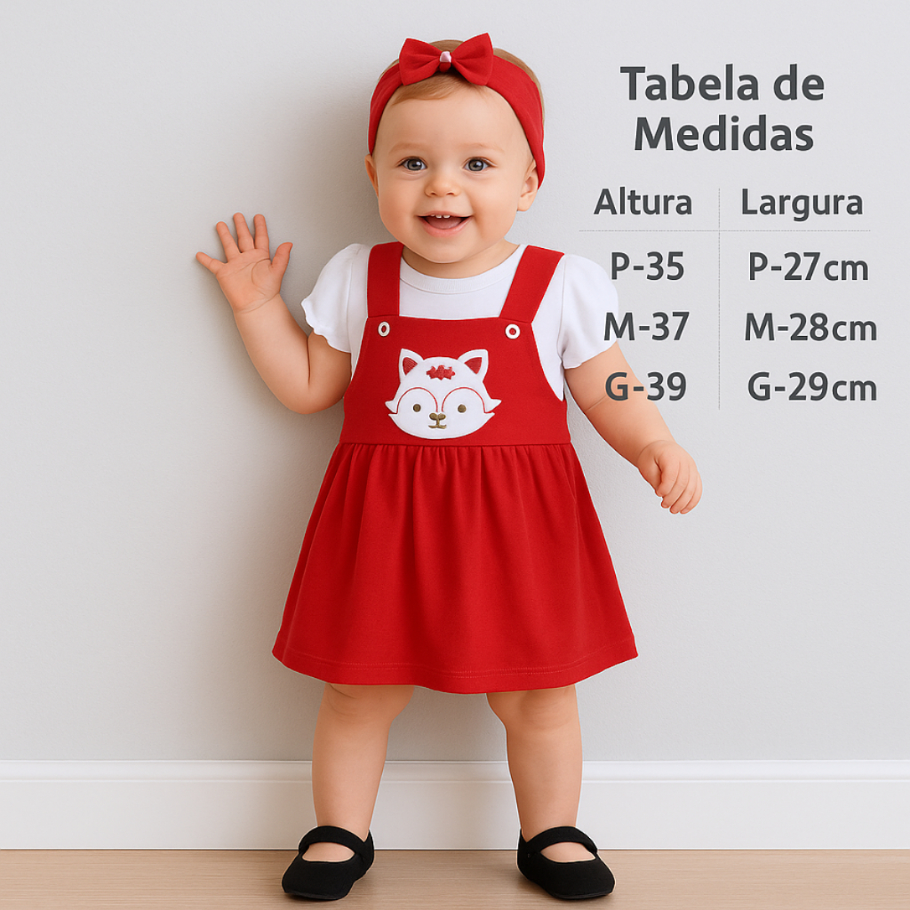 ----------------------------------------- Conteúdo da Embalagem ----------------------------------------- 01 Salopete Bordado 01 Blusinha canelada 01 Tiara com laço e pérola ------------------------ Descrição ------------------------ Encante-se com esse lindo conjunto 3 peças para bebês meninas! 👶✨ Composto por salopete bordada, blusinha canelada branca e tiara com laço e pérola 💖 Confeccionado em malha 100% algodão, garante conforto e suavidade para a pele delicada do bebê 🌸 Perfeito para passeios, fotos ou presentear com muito estilo e carinho! 🎁💕 -------------------- Especificações -------------------- Altura Largura P - 35 cm P - 27 cm M - 37 cm M - 28 cm G - 39 cm G - 29 cm Novo: Sim Pronta Entrega: Sim Material: Malha Cor: Vermelha e Azul Marinho Composição: 100% Algodão.