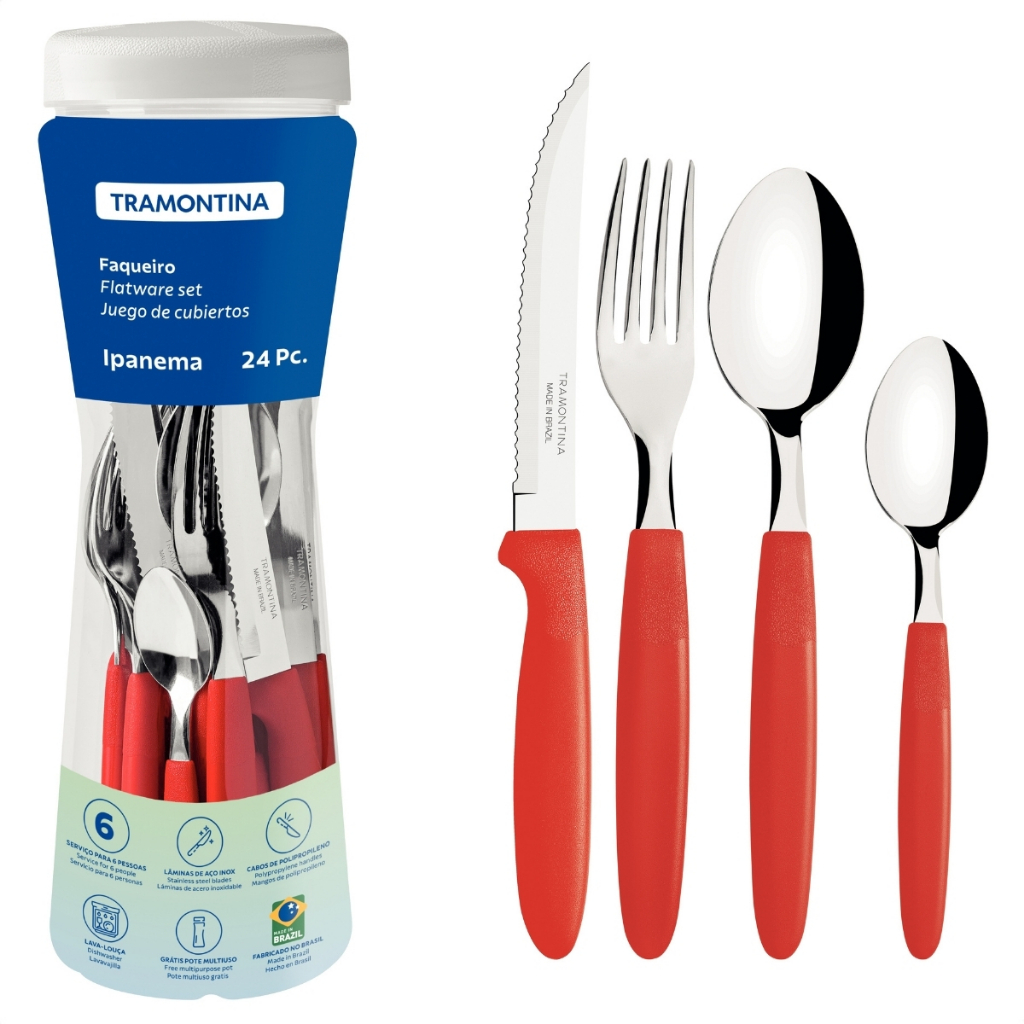 O anuncio contém: 06 Facas de Mesa, 06 Garfos De Mesa, 06 Colheres de Mesa, 06 Colheres de Chá. Perguntas frequentes: Serve para lava louças? Sim; Vem com pote plástico? Sim; Vem quantas peças no faqueiro? Vem 24 peças; É original da Tramontina? Sim. Garanta uma mesa muito mais prática e bonita com o Faqueiro Tramontina Ipanema com Lâminas em Aço Inox e Cabos de Polipropileno com Pote Plástico 24 Peças. Benefícios: Suas peças possuem lâminas produzidas em aço inox e contam com cabos de polipropileno, ambas características que proporcionam durabilidade, resistência e as tornam perfeitas para uso diário. Ele vem na cor cinza e garante que suas refeições diárias sejam muito mais modernas e elegantes. O faqueiro ainda é muito fácil de limpar e pode ir à máquina de lavar louças, facilitando sua rotina na cozinha. Ele vem acompanhado de um pote plástico, ideal para armazenar e guardar os talheres ou alimentos! Informações: Dimensões aproximadas da embalagem (AxLxC): 30cm x 10cm x 10cm; Dimensões aproximadas da colher de sopa (C): 19cm; Dimensões aproximadas da colher de chá (C): 14cm; Dimensões aproximadas do garfo (C): 19cm; Dimensões aproximadas da faca (C): 21,5cm; Material do cabo: Polipropileno; Material dos talheres: Aço Inox; Quantidade de peças do faqueiro: 24 peças; Lava-louças: Serve para lava-louças; Fabricante: Tramontina. -Garantia: 03 meses contra defeitos de fabricação. -Produto novo e em estoque. -As cores do tecido ou desenhos do produto podem variar de acordo com o lote de fabricação.