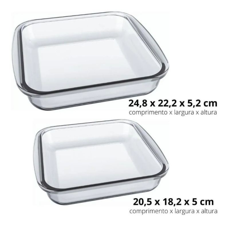 Conjunto Assadeiras Quadradas Marinex Nadir Vidro - Kit 2 Pecas O conjunto consiste em 2 unidades conforme abaixo: Assadeira Quadrada 1,1L - C =20,5cm L = 18,2cm A = 5cm Assadeira Quadrada 1,8L - C =24,8cm L = 22,2cm A = 5,2cm As Assadeiras Marinex podem ser usadas para preparar, assar, servir alimentos prontos. É ideal para uso em fornos convencionais, de micro-ondas, lava-louças e freezer. Produzido em vidro de altissima qualidade; higiênico e fácil de limpar.
