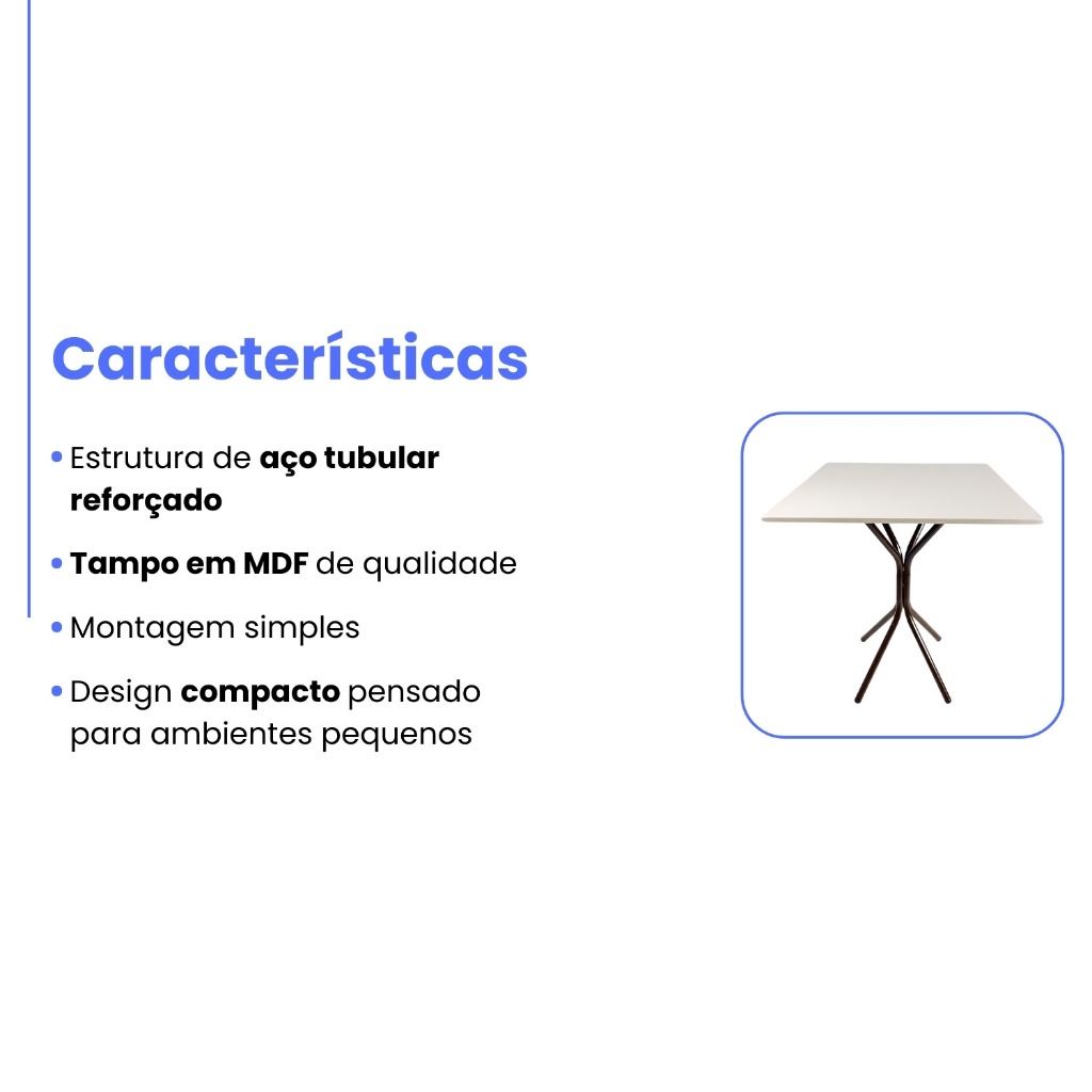 Com visual elegante e estrutura reforçada, o Conjunto Atlanta é perfeito para quem busca um ambiente bonito e prático. Ideal para cozinhas, salas de jantar ou varandas gourmet, ele oferece conforto e durabilidade no uso diário. Especificações Técnicas Mesa Altura: 75 cm Largura do tampo: 68 cm Profundidade do tampo: 68 cm Material da estrutura: Aço tubular com pintura em verniz Tampo: MDF Cadeiras Altura total: 90 cm Altura do assento: 45 cm Largura: 40 cm Profundidade: 45 cm Estrutura: Aço tubular com pintura em verniz Assento: Estofado com espuma, garantindo maior conforto Diferenciais • Design moderno e versátil, ideal para diferentes tipos de ambientes • Estrutura metálica resistente, com acabamento em verniz • Assentos estofados, oferecendo mais comodidade nas refeições • Conjunto compacto, perfeito para otimização de espaço Itens Inclusos 01 Base de mesa 01 Tampo de mesa 68x68 cm 04 Cadeiras 01 Manual de Instruções Transforme seu espaço com o Conjunto Atlanta ? a união perfeita entre estilo, resistência e conforto no seu dia a dia!