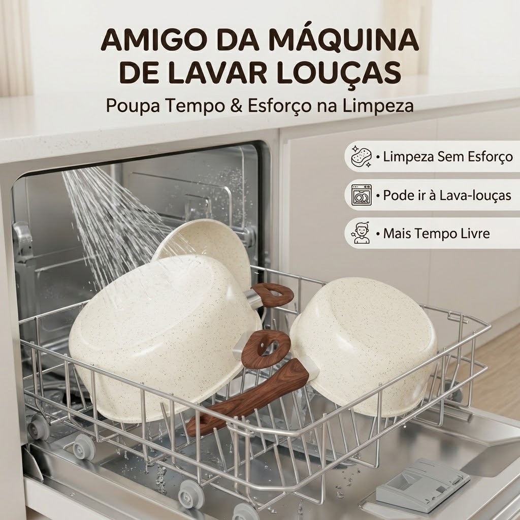 Conjunto Jogo De Panelas 5 Peças Indução Ceramica Panela Caçarola Frigideira Antiaderente Com Tampa Vidro Shokki Descubra a elegância e a máxima funcionalidade para a sua cozinha com o Jogo de Panelas. Desenvolvido para quem não abre mão de qualidade e sofisticação, este conjunto apresenta um design moderno em um tom de preto vibrante que transforma o ambiente. Fabricadas com estrutura robusta em alumínio e revestimento interno em cerâmica, as peças garantem um cozimento rápido, uniforme e altamente eficiente. O avançado revestimento antiaderente cerâmico impede que os alimentos grudem, permitindo um preparo mais saudável com menos óleo e uma limpeza sem esforço. Compatível com todos os tipos de fogão, incluindo os modernos cooktops de indução, o conjunto oferece versatilidade total. Para sua segurança e conforto, as alças e cabos são produzidos em baquelite com acabamento soft-touch, que não esquentam durante o uso. Além disso, as tampas de vidro temperado com borda em silicone proporcionam um fechamento perfeito. Podendo ir à máquina de lavar louças, o Jogo Viena é a escolha definitiva para otimizar seu tempo e elevar a arte de cozinhar. Especificações Técnicas: • Material dos Cabos/Alças: Baquelite com acabamento Soft-Touch • Material das Tampas: Vidro temperado com bordas protetoras em silicone • Compatibilidade: Funciona em todos os fogões, inclusive Indução • Limpeza: Pode ser lavado em máquina de lavar louças • Quantidade Total: 5 peças Composição e Dimensões: • 01 Caçarola: Diâmetro 24 cm x Altura 10,5 cm (Capacidade: 4,0 Litros) • 01 Caçarola: Diâmetro 20 cm x Altura 8,5 cm (Capacidade: 2,3 Litros) • 01 Panela: Diâmetro 18 cm x Altura 7,5 cm (Capacidade: 1,7 Litros) • 01 Panela: Diâmetro 16 cm x Altura 7,0 cm (Capacidade: 1,2 Litros) • 01 Frigideira: Diâmetro 24 cm x Altura 4,7 cm (Capacidade: 1,8 Litros) FAQ (Perguntas Frequentes): 1. Funciona em fogão de indução? Sim! O Jogo Viena possui fundo magnético especial, sendo 100% compatível com fogões e cooktops de indução, além dos modelos a gás e elétricos. 2. Os alimentos grudam no fundo? Não. O revestimento interno em cerâmica possui altíssimo poder antiaderente, permitindo cozinhar com o mínimo de óleo e facilitando muito a limpeza pós-refeição. 3. Posso colocar as panelas na lava-louças? Sim, todas as peças deste conjunto são seguras para a máquina de lavar louças, trazendo ainda mais praticidade para a sua rotina. 4. As tampas protegem as bordas da panela? Sim, as tampas são de vidro temperado (para acompanhamento do cozimento) e possuem bordas em silicone que vedam perfeitamente e evitam atritos com o revestimento. Conteúdo da Embalagem: • 02 Caçarolas com Tampa de Vidro (24cm e 20cm) • 02 Panelas com Tampa de Vidro (18cm e 16cm) • 01 Frigideira (24cm) Importante: Valor do Kit Imagens Meramente Ilustrativas. Não nos responsabilizamos pelo mau uso do produto