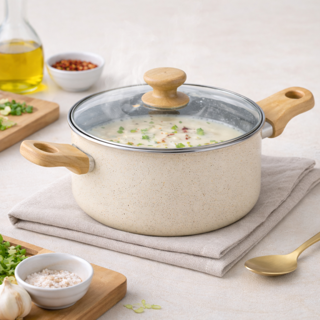 ✨ Conjunto de Panelas Sayonara 5 Peças Antiaderente Tipo Granito – performance profissional com visual moderno! DIFERENCIAIS • Antiaderente tipo granito: mais saudável, sem grudar • Tampas de vidro temperado com respiro: controle de vapor • Cabos amadeirados: toque agradável e seguro • Cores: Creme | Preto 📦 ITENS DO CONJUNTO (5 PEÇAS, TAMPAS NÃO ENTRAM NA CONTAGEM) 1) Panela – [Ø 22 cm • Arroz, legumes e molhos do dia a dia. 2) Panela – [Ø 18 cm • Segunda capacidade para preparar acompanhamentos. 3) Caçarola – [Ø 20 cm • Ideal para sopas, macarronadas e cozidos. 4) Frigideira – [Ø 20 cm • Grelhados, omeletes, panquecas sem esforço. 5) Leiteira/Fervedor – [Ø 14 cm • Ferver leite, aquecer água e preparar cafés. 📝 Inclui tampas de vidro compatíveis para as panelas/caçarola (com respiro)