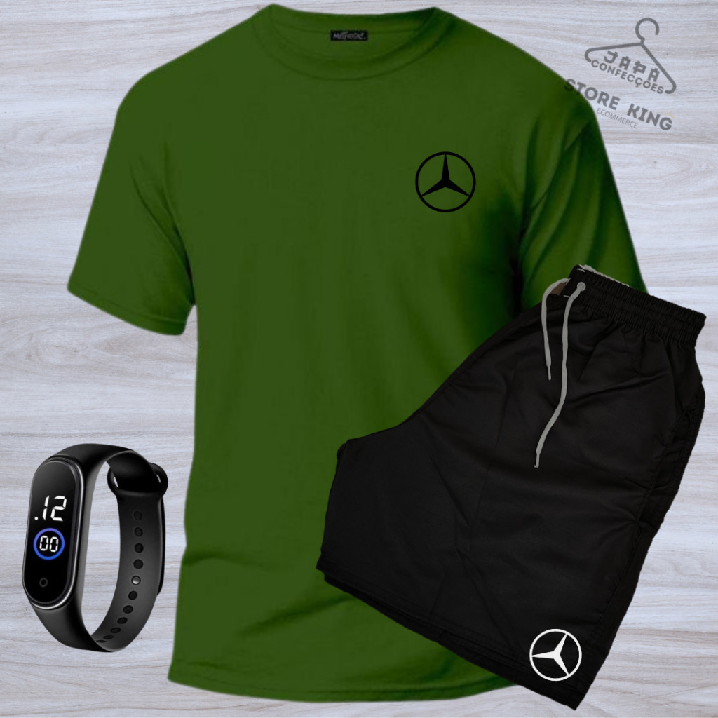 Conjunto Kit camiseta 100% algodão 30,1 bermuda leve para caminhada e academia MERCEDEZ + RELOGIO DIGITAL