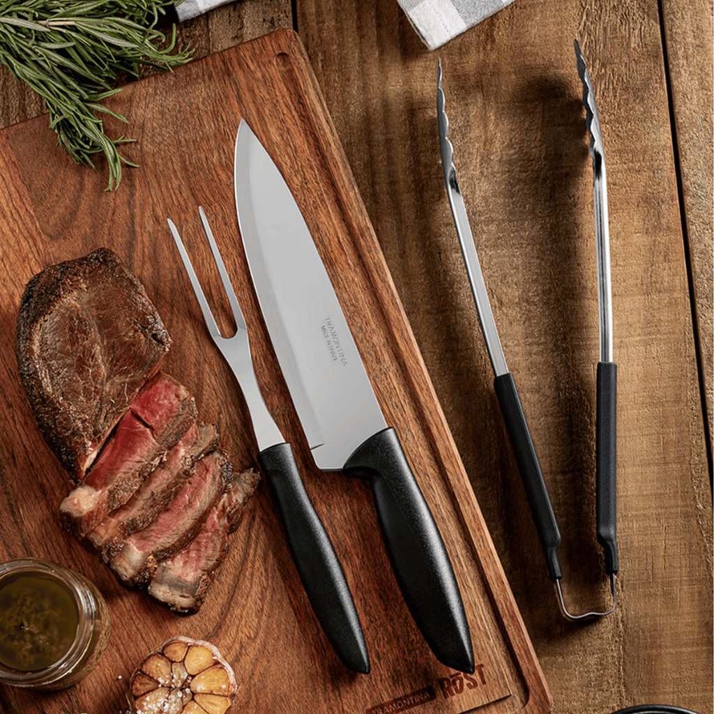 KIT CHURRASCO 3 PEÇAS MOOB – PRATICIDADE E ESTILO PARA SEU CHURRASCO Reúna amigos e família com mais praticidade e sofisticação com o Kit Churrasco 3 Peças Moob. Produzido com materiais resistentes e acabamento refinado, ele oferece tudo o que você precisa para preparar e servir as melhores carnes com segurança e eficiência. Composto por faca, garfo e pegador, o kit é ideal para quem busca utensílios de qualidade, duráveis e fáceis de limpar. O design moderno na cor preta combina com qualquer ambiente, tornando o churrasco ainda mais completo. CARACTERÍSTICAS Kit com 3 peças funcionais: 1 Pegador de alimentos – 36 cm 1 Garfo para churrasco – 35,3 cm 1 Faca para churrasco – 35,5 cm Material resistente e fácil de higienizar Design moderno e ergonômico Ideal para churrascos, confraternizações e uso doméstico Peso total: 450 g CUIDADOS Manter fora do alcance de crianças. Secar bem após a lavagem para garantir maior durabilidade. Evitar uso de produtos abrasivos. DICAS PARA UM CHURRASCO PERFEITO Use carvão seco e de boa qualidade. Acenda com segurança – evite álcool líquido. Prefira carnes com marmoreio e boa gordura. Mantenha distância correta entre a carne e o braseiro. Calcule a quantidade ideal de carne por pessoa.