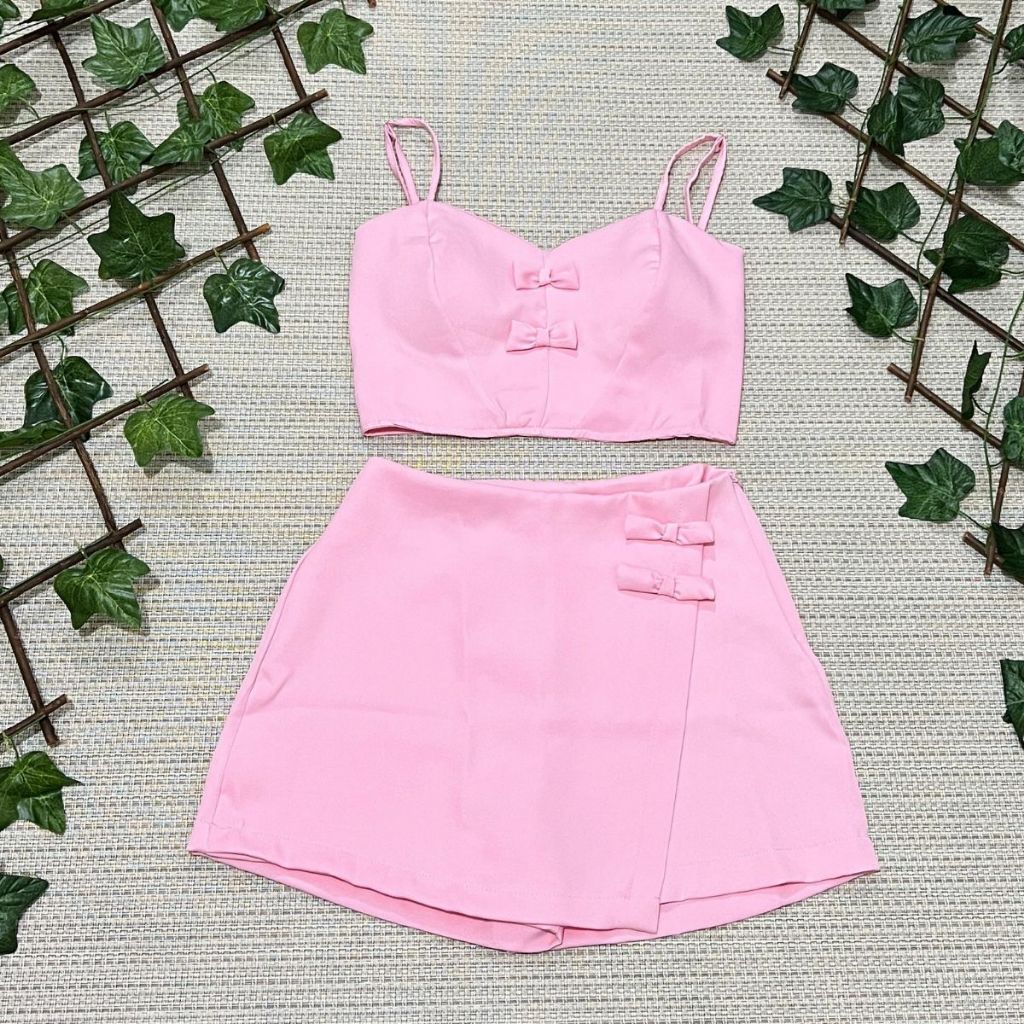 Conjunto laços alfaiataria short saia e top cropped , short saia com zíper lateral