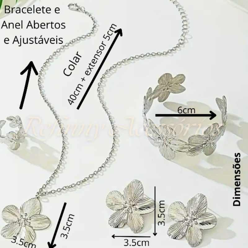 Conjunto Lançamento Super Luxo Flores Colar Brincos Pulseira Bracelete e Anel Prata e Dourado 18k