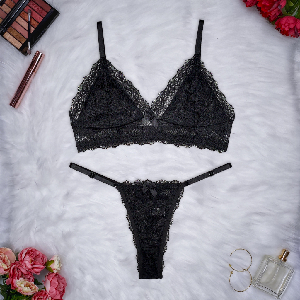 Conjunto Lingerie Renda Bicolor Sutiã Sem Bojo Com Forro Calcinha com Regulagem String Angelina