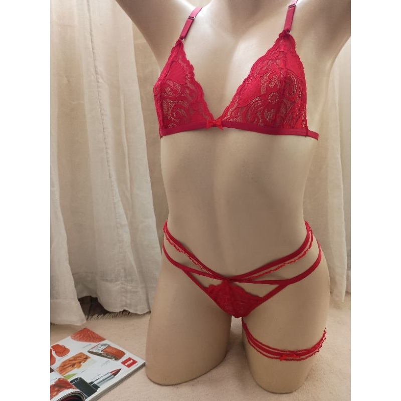 Conjunto todo em renda,modelo bralette com alças reguláveis,calcinha fio possui forro de algodão,alças com regulagens e cós com babadinho,conjunto acompanha uma liga persex de babadinho.