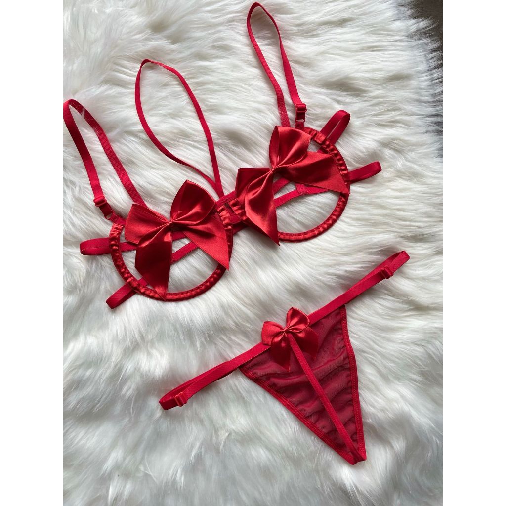 Conjunto Lingerie Sexy Sutiã Aro Laço Meia Taça + Calcinha Fio Dental