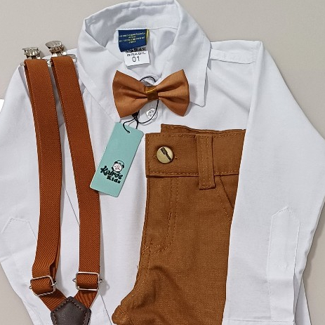 Comjunto Luxo Caramelo TECIDO DE ALTÍSSIMA QUALIDADE PERIPAN CAMISA 100% ALGODÃO CALÇA ESPORTE FINO 98% ALGODÃO E 2% ELASTANO DANDO LEVEZA E CAIMENTO NA PEÇA ACOMPANHA: 1Camisa Branca Manga Longa 1 Calça Spot Fino Caramelo 1Gravata Borboleta Caramelo 1Suspensório Caramelo MEDIDAS: (Camisa Manga Longa) TECIDO 70% ALGODÃO, 30% POLIÉSTER. 1 ANO -- Comprimento: 39cm Largura: 32cm Comprimento da manga: 35cm 2 ANOS -- Comprimento: 41cm Largura: 34cm Comprimento da manga: 36cm 3 ANOS -- Comprimento: 42cm Largura: 33cm Comprimento da manga: 38cm 4 ANOS -- Comprimento: 43cm Largura: 36cm Comprimento da manga: 38cm 6 ANOS -- Comprimento: 46 cm Largura: 37cm Comprimento da manga: 40cm 8 ANOS -- Comprimento: 49cm Largura: 40cm Comprimento da manga: 43cm 10 ANOS: Comprimento: 51cm Largura: 42cm Comprimento da manga: 46cm (Calça) - TECIDO: 98% BRIM, 2% ELASTANO 1 ANO - largura 25 cm/ largura circular 50 cm/ comprimento 48 cm 2 ANOS - largura 26 cm/ largura circular 52 cm/ comprimento 51 cm 3 ANOS - largura 27 cm/largura circular 54 cm/ comprimento 54 cm 4 ANOS - largura 30 cm/largura circular 60 cm/ comprimento 62 cm 6 ANOS - largura 32 cm/largura circular 64 cm/ comprimento 71 cm 8 ANOS - largura 33 cm/largura circular 66 cm/ comprimento 74 cm 10 ANOS - largura 34 cm/largura circular 68 cm/ comprimento 80 cm KairósKidsModa Infantil Agradece a Preferência.