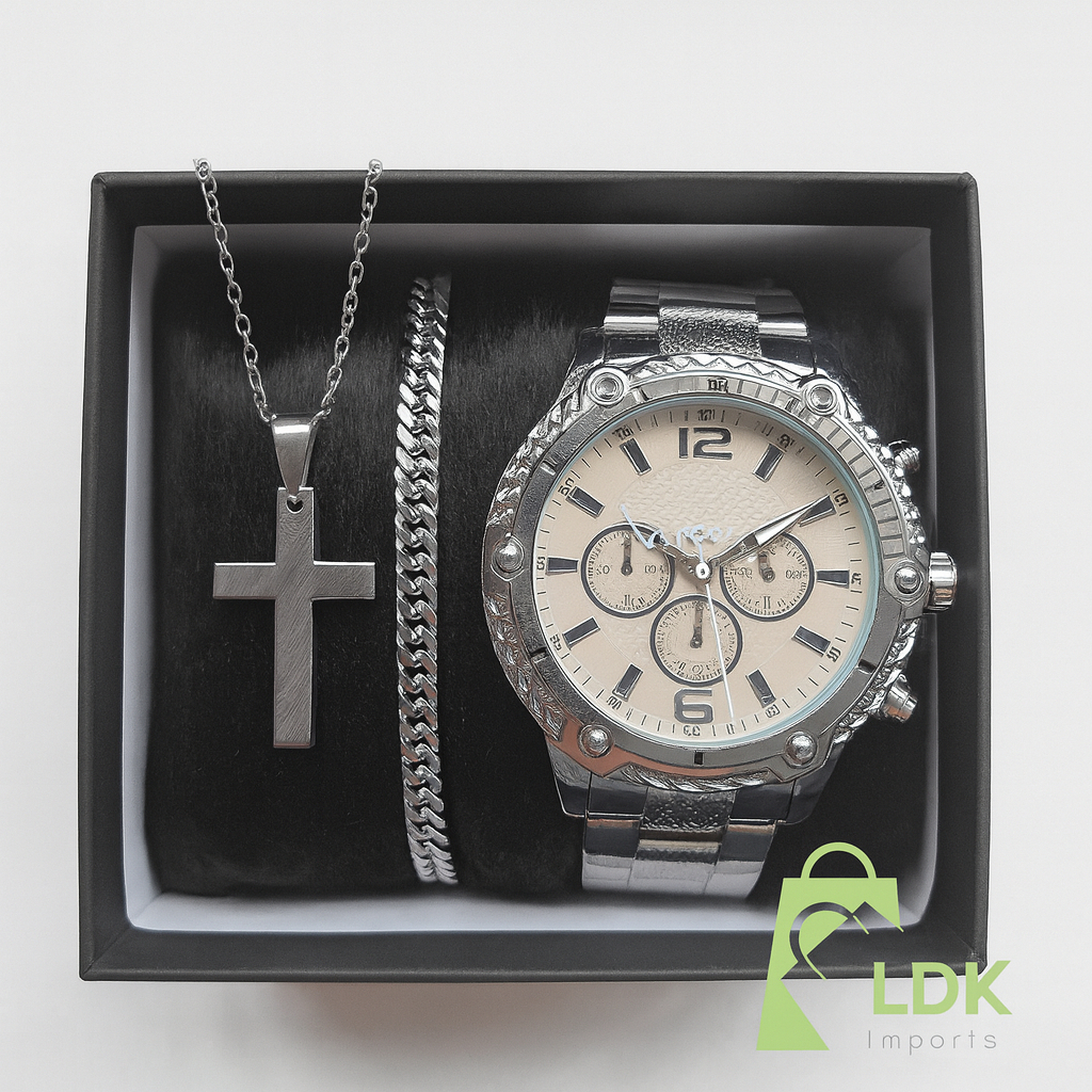 Conjunto Luxo Relógio Masculino Aço Inox + Corrente Com Cruz e Pulseira Grossa Premium