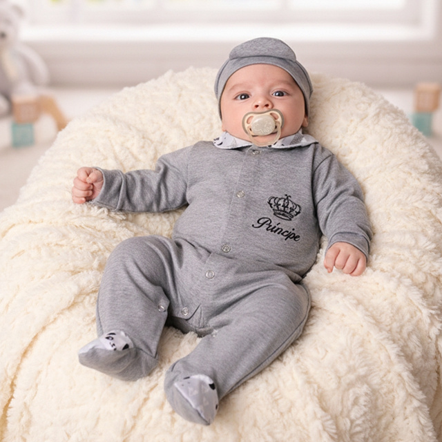 Conjunto Macacão Manga Longa Para Bebê Menino Com Boné Príncipe 02 Peças Cinza