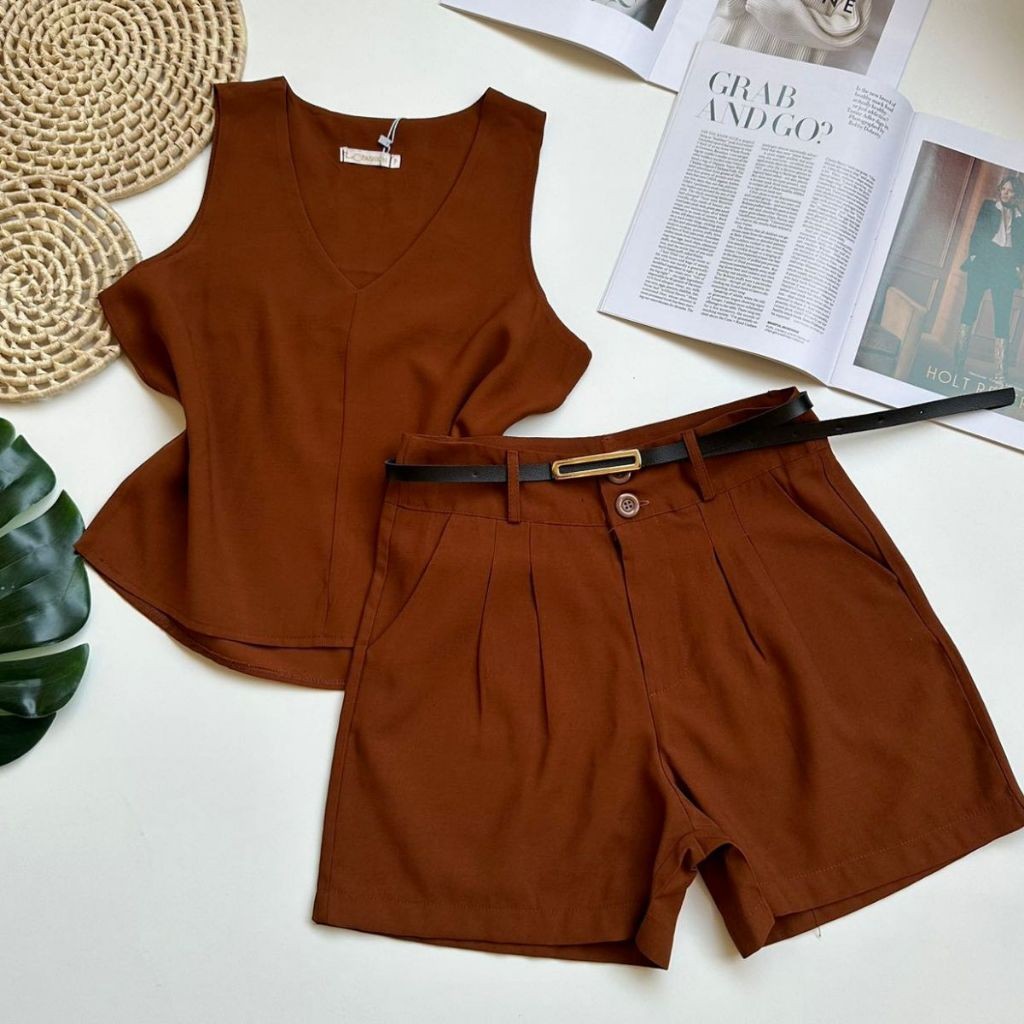 Conjunto marrant feminino de camiseta sem mangas e shorts com cinto