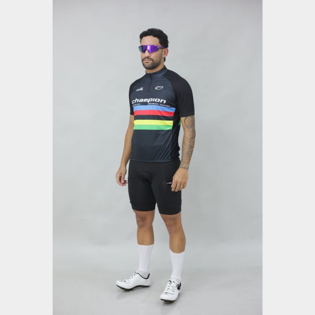 Conjunto Masculino de Ciclismo – Camisa Zíper Parcial + Bermuda com Forro em Gel - Conforto, desempenho e estilo em um único kit. Ideal para ciclistas que pedalam com frequência e buscam peças funcionais e duráveis. Contém: – 1 Camisa Masculina de Ciclismo – 1 Bermuda Masculina com Forro em Gel Camisa de Ciclismo - Feita com tecido leve e tecnológico, garante ajuste ao corpo, proteção solar e excelente ventilação. – Modelagem slim Elite e Premium – ajuste preciso ao corpo – Elástico na barra – evita que a camisa suba durante o pedal – 3 bolsos traseiros – práticos para itens como celular e chaves – Zíper de 15 cm – facilita a ventilação – Proteção UV – ideal para pedais ao ar livre – Secagem rápida – mantém o corpo seco – Estampa sublimada – cores vivas e duráveis – Tecido antibacteriano e antimicrobiano Composição: 100% Poliéster Sublimado Bermuda com Forro em Gel -Confortável e resistente, ideal para pedais de média a longa duração. – Tecido flexível e respirável – Corte anatômico e cós alto – mais conforto e estabilidade – Forro em Gel D80– amortecimento e proteção contra atritos – Proteção UV e secagem rápida Atenção: Modelagem da camisa é slim. Consulte a tabela de medidas antes da compra.