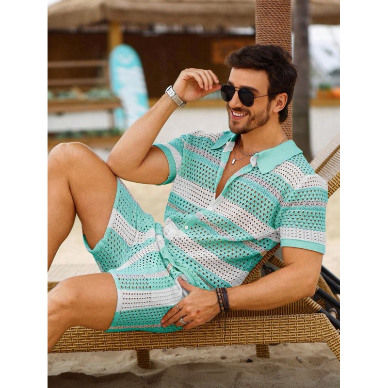Conjunto Resort Masculino com Listras Vazadas - Descrição do Produto Livro-texto A blusa possui lapela, mangas curtas e um design vazado listrado em preto e branco, criando um visual estiloso e refrescante, permitindo que você diga adeus ao calor escaldante nas suas férias tropicais. A parte de baixo tem o comprimento mais curto, feita do mesmo material vazado listrado em preto e branco. Disponível em uma variedade de modelos, esta versão minimalista é perfeita para qualquer tipo de corpo. Seja passeando na praia, festejando em uma festa à beira-mar ou explorando um destino tropical, este conjunto permite que você se destaque da multidão sem esforço e se torne o ponto focal estiloso das suas férias. Infundindo cada experiência de férias com o charme duplo da moda e do charme de uma cidade pequena.
