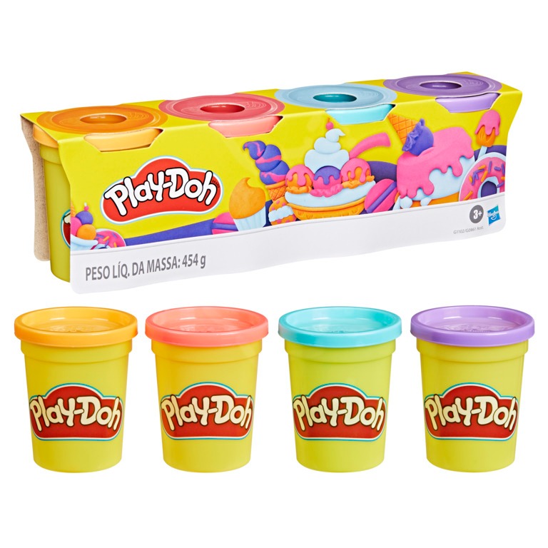 PACOTE COM 4 CORES PLAY-DOH: Brinquedos criativos para crianças a partir dos 2 anos, atividades de artes e artesanato para crianças, este kit traz quatro vezes mais diversão com 4 pacotes de massa de modelar Play-Doh!; VEM COM 4 CORES PLAY-DOH: Com 4 potes de massa Play-Doh atóxica em potes de 112 g em cores diferentes, as crianças podem moldar e criar sem parar; CORES CLÁSSICAS: As crianças podem ser criativas com cores clássicas neste pacote de variedades Play-Doh; BRINQUEDOS PARA CRIANÇAS, PRESENTES, BRINDES DE FESTA E MAIS: Brinquedos para crianças dinâmicas, lembrancinhas, prêmios em sala de aula, presentinhos para ocasiões especiais e muito mais!; A QUALIDADE CONHECIDA POR TODOS: A massa de modelar Play-Doh é a favorita desde 1956! É feita basicamente de água, sal e farinha de trigo e passa por rigorosos testes para manter sua qualidade.