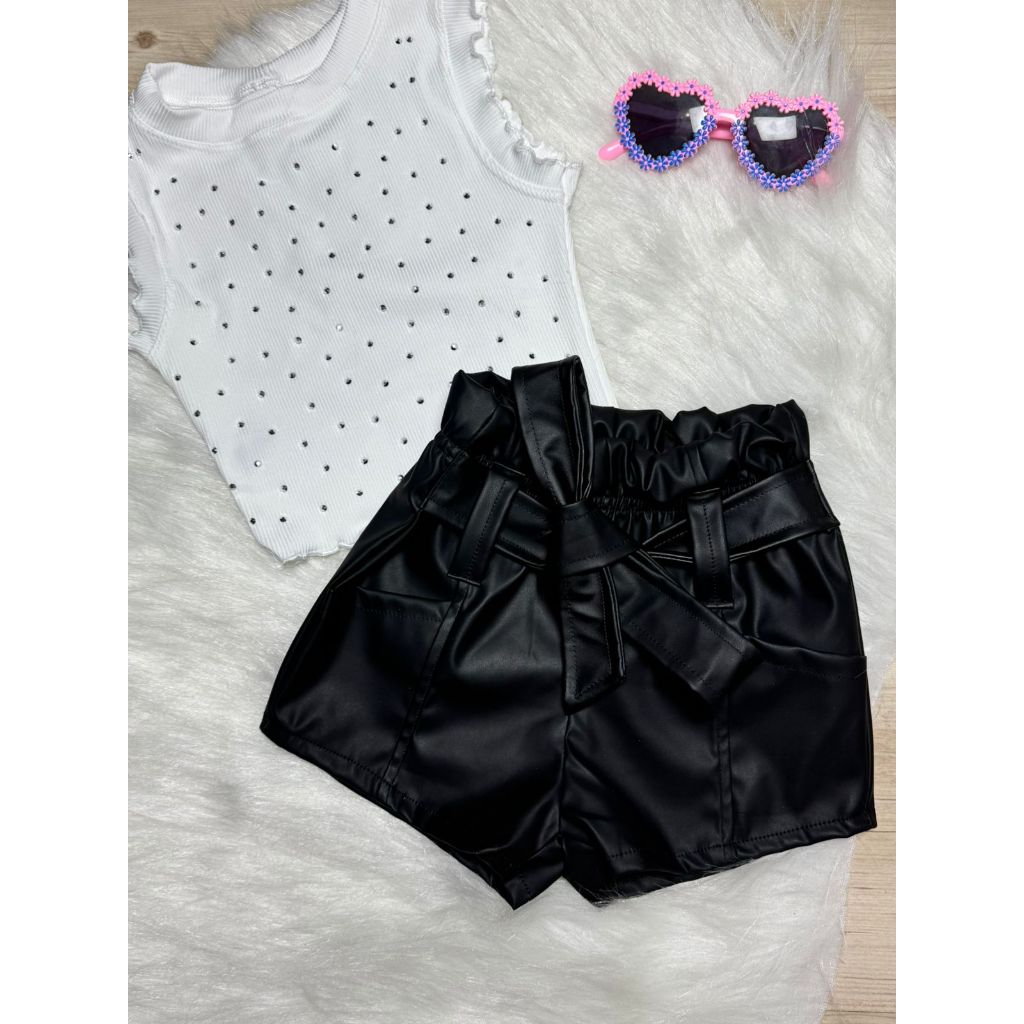 Conjunto Meninas Blusinha com Strass e Shorts Corino Fake com Laço 02 ao 10 anos