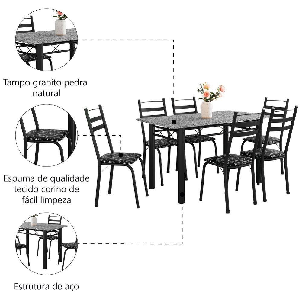 Conjunto Mesa Itália 6 Cadeiras 1,40m Preto/Floral Granito