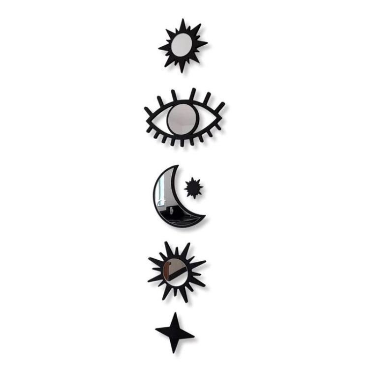 Conjunto Místico 6 Peças Espelhos Acrílico Decorativo Celestial com Moldura MDF Preto