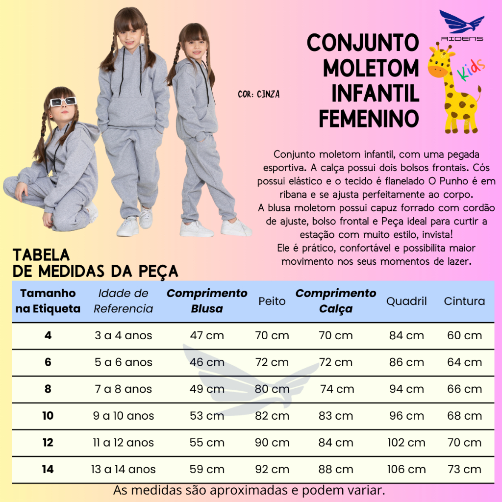 Descrição RIDENS MODAS Apresentamos um conjunto de moletom infantil perfeito para o seu pequeno! A calça possui dois bolsos frontais, cós elástico e tecido flanelado para máximo conforto. A blusa de moletom acompanha capuz forrado com cordão de ajuste, bolso frontal . É a escolha ideal para seu filho curtir a estação com muito estilo. Invista já! Ele é prático, confortável e possibilita maior movimento nos seus momentos de lazer. Características: Ø Marca: RIDENS MODAS Ø Tecido macio Ø Cós elástico Ø Bolsos funcionais Ø Material: Moletom Ø Composição: 50% Algodão, 50% Poliéster Ø Modelagem: Infantil Ø Tamanhos: do 04 ao 14