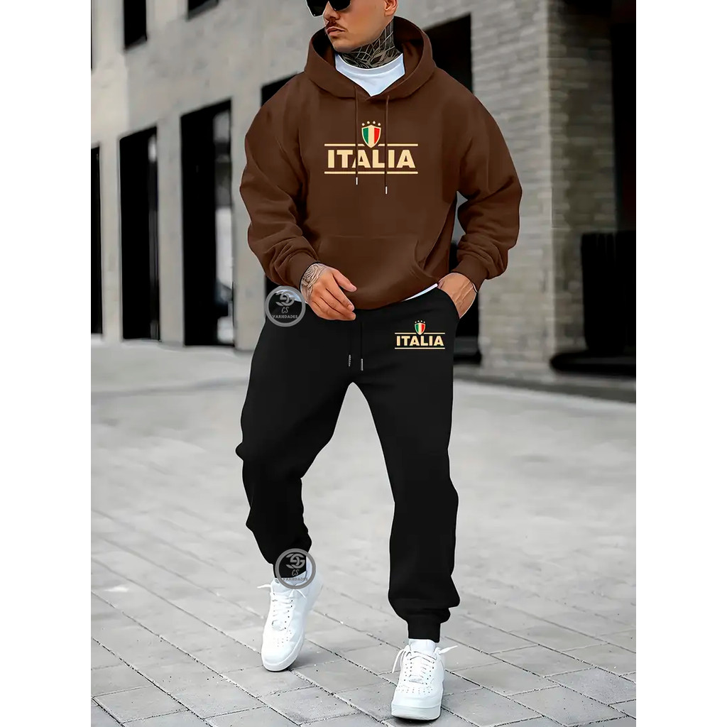 Conjunto Moletom Italia Estampado Blusa de Frio Calça moletom Abrigo de inverno com capuz e Bolso streetwear Flanelado