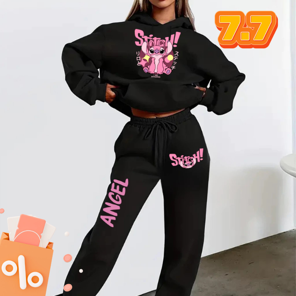 Conjunto Moletom Tradicional Feminino Inverno Blusa Canguru E Calça Moletom Lilo Stitch Angel Rosa Blue Fofo Cartoon