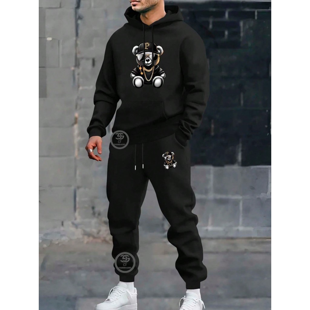 Conjunto Moletom Urso Bad Boy Bear Estampa Blusa de Frio moletom com capuz + Calça Moda casual streetwear Flanelado