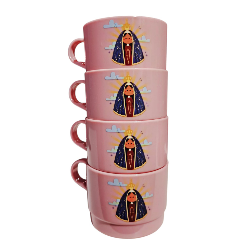 Conjunto Nossa Senhora com 4 Xícaras de Acrílico 200 ml Empilhavél na caixa.