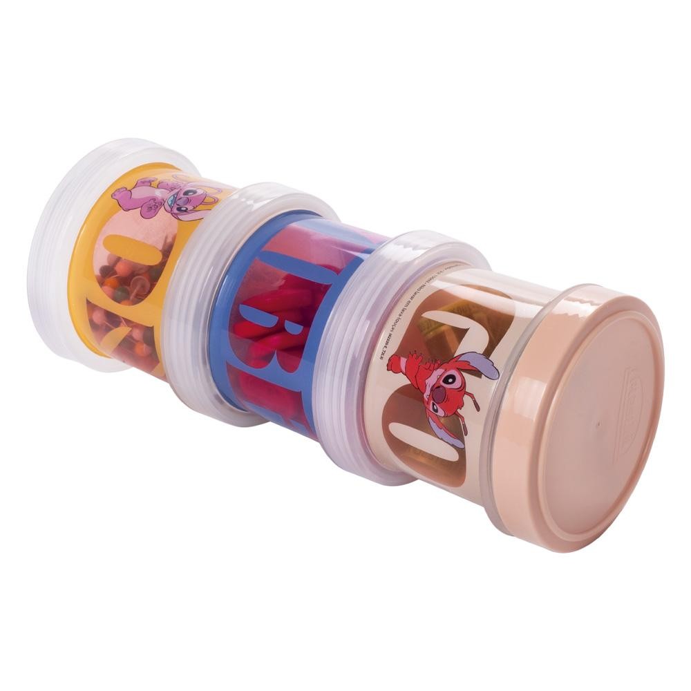 Conjunto Organizador Stitch Empilhável Disney Plasútil Dimensao: (Diâmetro x Alt): 7,3x18,3 cm - O conjunto é composto por 3 peças rosqueáveis entre si, sendo que apenas a primeira possui tampa individual. Nas outras duas, o organizador de cima atua como fechamento. - Cada compartimento possui 150 ml. - Ideal para organizar snacks, miudezas, itens de escritório ou papelaria, itens de cabelo... - Fabricado em plástico polipropileno (PP). Atóxico e livre de bisfenol-A (BPA FREE)..