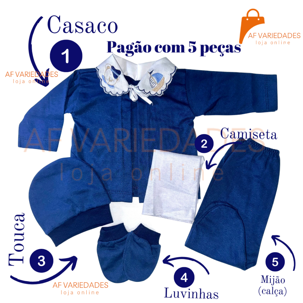 O pagão é uma roupa de bebê que cobre todo o corpo, geralmente se é usado muito para levar para as trocas de roupinhas na maternidade, feito de um tecido macio e confortável. É uma opção popular para recém nascidos, pois é fácil de vestir e proporciona conforto e calor ao bebe. TAMANHO ÚNICO Veste bebê de 0 a 3 meses aproximadamente, mas claro que depende muito do tamanho do bebê. Garantimos que vá a cor escolhida o bordado da gola pode ser que vá aleatório. ******NÃO SÃO 5 KITS, SÃO 5 PEÇAS****** O que são as 5 peças? • 1 Casaco • 1 Camiseta Interna • 1 Par de Luvas • 1 Touca • 1 Mijão (calça) ***Composição: *** 100% Algodão. Gola em Tecido Bordado. O Melhor Preço da Shopee! Envio Imediato!