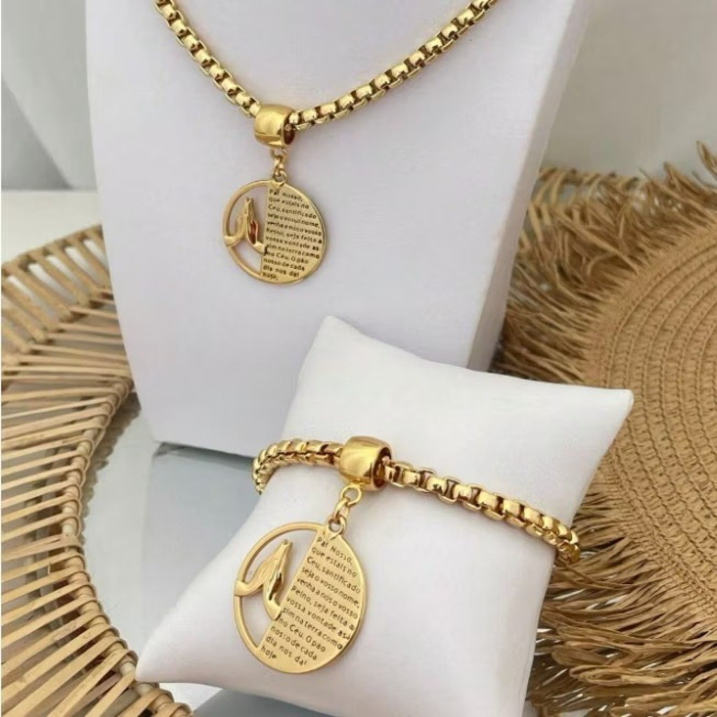 Conjunto Pai nosso Feminino Colar + Pulseira Veneziana Grossa