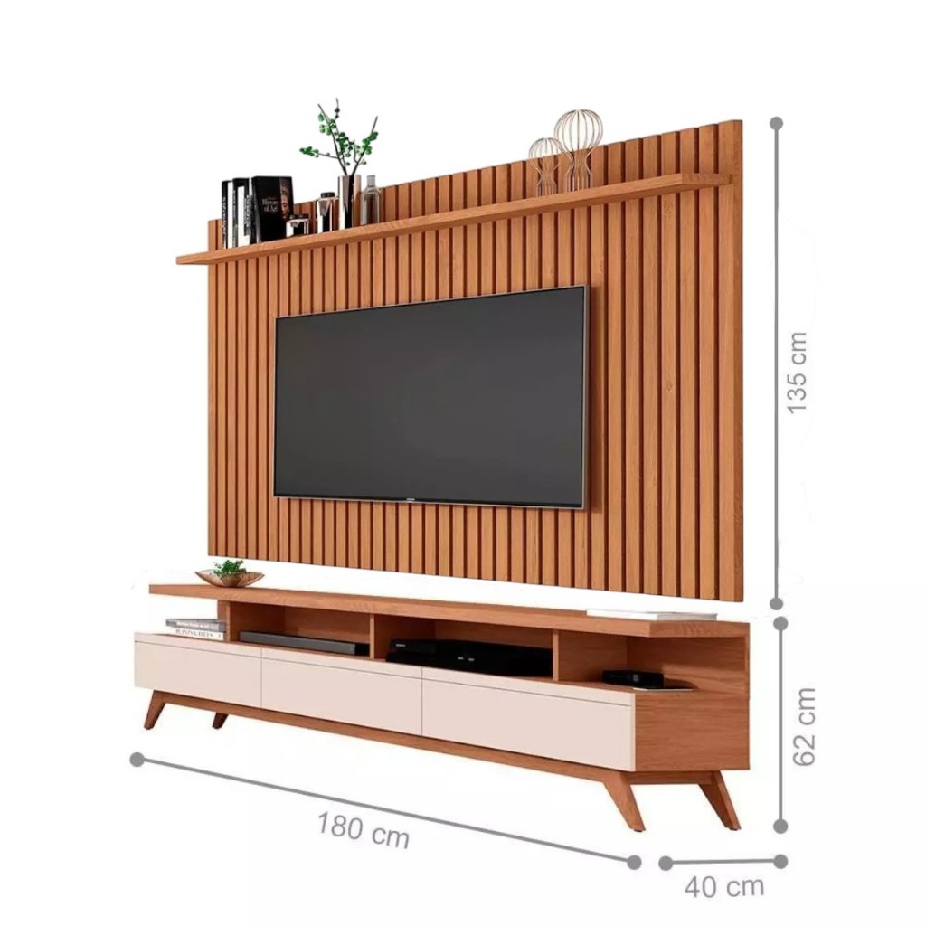 O Conjunto de Rack com Painel é ideal para quem deseja montar um painel de TV completo e deixar a sala mais elegante e moderna. Projetado para suportar TVs de até 60 polegadas, ele entrega um visual sofisticado com painel ripado em alto relevo e ótima organização para aparelhos, decoração e acessórios. O painel possui prateleira para acomodar objetos decorativos, plantas, livros, videogames e aparelhos de TV, além de passa fio para facilitar a organização dos cabos e manter o ambiente mais limpo. O rack conta com 3 gavetas com corrediças telescópicas, permitindo abertura total com deslizamento suave e preciso. O conjunto é produzido em MDP com pintura UV e acabamento em material sintético, proporcionando mais resistência e durabilidade. Principais diferenciais • Conjunto rack com painel para sala • Suporta TV de até 60 polegadas • Painel ripado em alto relevo, visual moderno • Prateleira no painel para decoração e eletrônicos • Passa fio no painel para organização de cabos • Rack com 2 gavetas com corrediças telescópicas (abertura total) • Prateleira e nichos para acomodar aparelhos e acessórios • Pés em madeira (4) no rack • Material em MDP com pintura UV e acabamento em material sintético Dimensões do painel • Altura: 135 cm • Largura: 188,5 cm • Profundidade: 20,5 cm Especificações do painel • Cor: Nature • Material principal: MDP • Suporta TVs de até 60 polegadas • Pintura: UV • Prateleira: sim (1) • Passa fio: sim (1) • Acabamento: ripado em alto relevo Dimensões do rack • Altura: 62 cm • Largura: 180 cm • Profundidade: 40 cm Especificações do rack • Cor: Nature/Off White • Material: MDP • Prateleiras: sim (1) • Nichos: sim (4) • Gavetas: sim (3) com corrediças telescópicas • Pés: sim (4) em madeira • Tampo: sim, encabeçado em MDP • Espaço para TV: 1800 x 1000 mm Itens inclusos • 01 Painel • 01 Rack • Kit completo para montagem • Manual de instruções Garantia 3 meses contra defeito de fabricação Informações importantes • Fotos meramente ilustrativas do produto no ambiente. • Os objetos que ambientam as fotos não acompanham o produto. • Verificar descrição e tamanho do produto antes da compra. • Avaliar a mercadoria no ato do recebimento e recuse em caso de divergência ou avarias. • Mantenha as informações de contato e endereço de entrega atualizados para entrarmos em contato caso necessário. • Limpar com flanela ou pano macio seco. Não utilizar produtos abrasivos, desengordurantes, álcool ou solvente. • Não expor o produto diretamente à luz solar e à umidade. Montagem e entrega • Sugerimos a contratação de um montador profissional. Não nos responsabilizamos por avarias causadas no ato da montagem. • Não nos responsabilizamos pela montagem e desmontagem do produto no ato da entrega e devolução, assim como os custos gerados nestas situações. • A transportadora entregará o produto no andar térreo do endereço de entrega. • Não nos responsabilizamos por subir escadas, corredores e elevadores ou transporte por guincho em apartamentos.