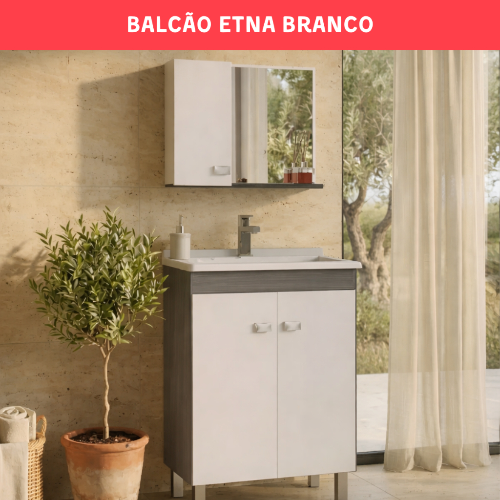 Organize e valorize seu banheiro com praticidade e design moderno. O Kit Econômico é a escolha perfeita para quem busca qualidade, funcionalidade e preço acessível. Com acabamento, ele combina elegância e resistência, ideal para banheiros compactos ou de uso diário. -------------------- O que acompanha: Gabinete com pés em MDF/MDP de alta durabilidade; Espelheira com porta basculante para organizar itens de higiene; Cuba em mármore sintético, resistente e de fácil limpeza. ------------------- Diponiveis nos Modelos: CARVALHO, NOGAL e ETNA. -------------------- Medidas aproximadas: Gabinete: 89 cm (A) x 56 cm (L) x 34 cm (P) Espelheira: 42 cm (A) x 52 cm (L) x 13 cm (P) Lavatório: 3 cm (A) x 58 cm (L) x 34 cm (P) -------------------- Especificações técnicas: Material: MDF/MDP com revestimento em tinta UV para maior proteção; Puxadores em ABS resistente; Fita de borda em PVC; Modelo: Com pés, instalação simples e funcional; Garantia de 12 meses contra defeitos de fabricação. -------------------- Diferenciais que fazem a diferença: Praticidade na montagem: enviado semi montado, basta instalar puxadores e pés; Design inteligente: espelheira e gabinete com portas, aumentando o espaço de organização; Durabilidade e resistência: pintura UV protege contra umidade e facilita a limpeza; Custo-benefício imbatível: conjunto completo por um valor acessível. -------------------- Observações importantes: O lavatório deve ser apoiado no gabinete (não recomendamos fixar na parede); Não acompanha válvula, torneira e demais acessórios hidráulicos (imagens ilustrativas). A instalação é de responsabilidade do comprador.