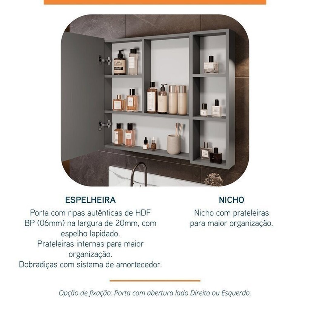 Conjunto para Banheiro Bancada em Porcelanato com Cuba Esculpida, Armário e Espelheira Ripy 80cm Cinza