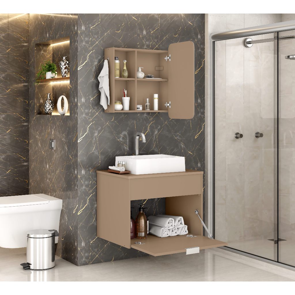 Acompanha: Espelheira com Espelho + Gabinete + Cuba Elevada + Nichos Laterais 📏DIMENSÕES DA ESPELHEIRA: - Altura Espelheira: 54 cm - Largura Espelheira: 47,5 cm - Profundidade: 13 cm 📏DIMENSÕES DO GABINETE: - Altura: 46,3 cm - Largura: 60 cm - Profundidade: 45 cm - Furo para torineira: 26mm/2,6cm 📏DIMENSÕES DA CUBA: - Altura: 10 cm - Largura: 40 cm - Profundidade: 30 cm - Furo para sifão: 40mm/4cm Transforme seu banheiro com o conjunto Duna. Com design contemporâneo e linhas minimalistas, oferece organização inteligente, amplo espaço interno e nichos integrados que mantêm a bancada sempre livre. A cuba em mármore sintético agrega sofisticação e praticidade, enquanto o móvel em MDF/MDP resistente à umidade garante durabilidade, fácil limpeza e acabamento impecável. A escolha ideal para quem busca funcionalidade, elegância e um toque de luxo no dia a dia. ℹ️ INFORMAÇÕES: - Material: Produzido em MDP e MDF de 15mm - Porta da espelheira com espelho orgânico e bordas arredondadas - Acompanha Cuba de Mármore Sintético - Material Cuba: Mármore Sintético - Tipo de cuba: De apoio/Suspensa/Sobreposta - Gabinete com porta com pistão a gás - Puxadores em alumínio (anti-corrosão) - Quantidade de furos para torneira: 01 (um) com 26mm - Inclui torneira: Não❌ - Inclui Válvula: Não❌ - Inclui kit hidráulico: Não❌ - Necessita montagem (KIT montagem incluso) - Produto acompanha manual de instrução detalhando passo a passo de como montar. - Produto é novo e lacrado com embalagem original. - Embalagem do envio: Papelão e plástico ℹ️ CONSERVAÇÃO DA CUBA: Não utilizar produtos químicos removedores, decapantes (removedor de tinta e soda), desengordurantes, ácidos ou alcalinos fortes ou a base de cloro ou soda cáustica. Limpeza diária com água e detergente neutro. Caso a superfície seja acidentalmente exposta a qualquer um dos produtos nocivos informado, ela de ser lavada imediatamente com água limpa para neutralizar o efeito dos mesmos. ⚠️ INFORMAÇÕES IMPORTANTES ⚠️ - Os objetos que ambientam as fotos não acompanham o produto; - É de inteira responsabilidade do cliente a montagem do produto e/ou instalação, assim como possíveis irregularidades provenientes de manuseio inadequado; - Embora o produto acompanhe o manual de montagem, verifique a complexidade antes de decidir montá-lo sozinho, recomendamos que contrate um profissional de sua confiança; - Fique atento, nossas cores podem sofrer alterações dependendo do seu monitor; - ANTES DE MONTAR O SEU PRODUTO, verifique se há alguma peça danificada, caso esteja, prestaremos a devida assistência dentro do prazo da garantia. *Recomenda-se limpar o produto com flanela ou pano macio seco, não utilizar produtos abrasivos, desengordurantes, álcool ou solvente. Mantê-lo em lugar livre de umidade e/ou exposição direta ao sol. 💬 Dúvidas? Entre em contato através da caixa de perguntas, temos uma equipe pronta para te atender! 💙 A equipe GAMA MÓVEIS E UTENSÍLIOS agradece sua preferência e confiança! 😊