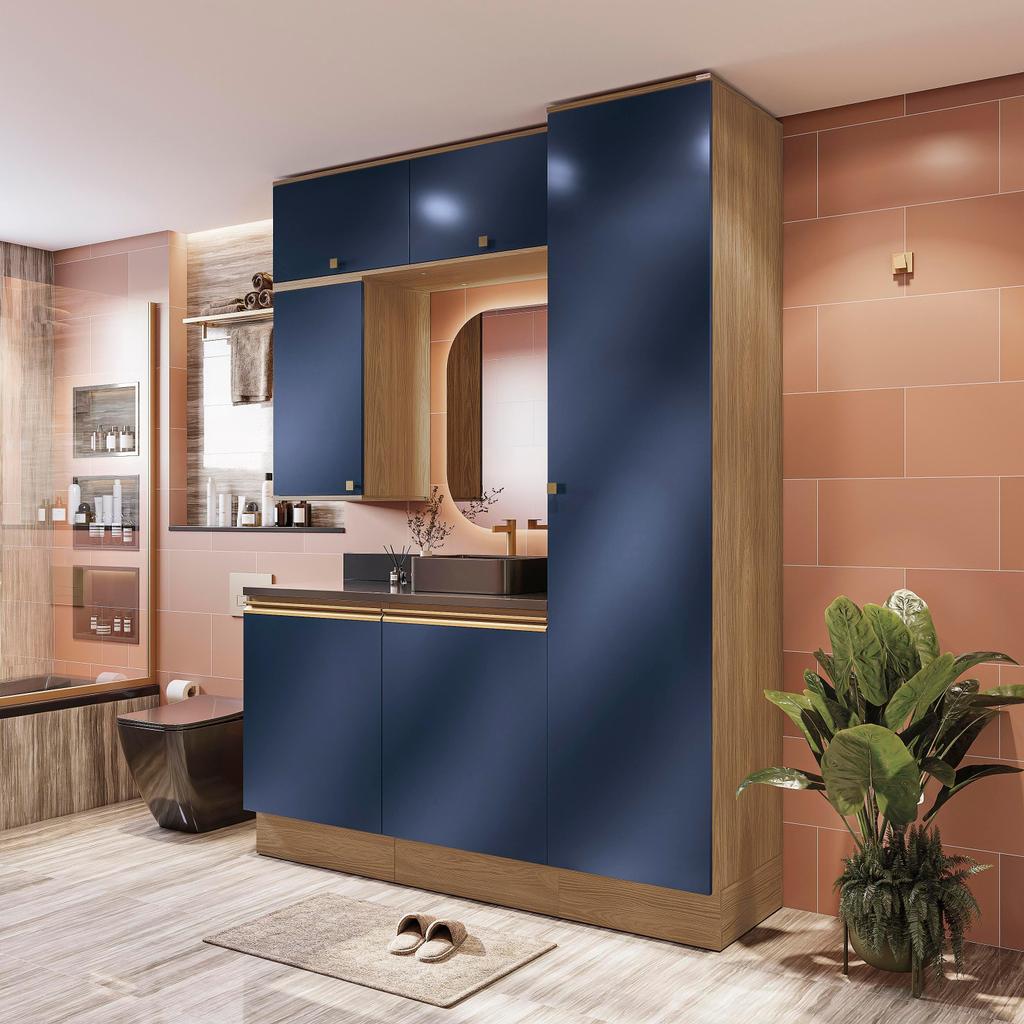 Espaçoso, versátil e com a qualidade do 100% MDF, o seu banheiro ficará ainda mais completo com o os módulos da Celeste da Kappesberg. Fáceis de adaptar, unindo beleza e praticidade, eles contam com pintura de até sete camadas. A caixaria é na cor nogueira, com acabamento touch, enquanto as frentes são em azul profundo, com acabamento fosco, a composição ideal para quem não abre mão de sofisticação e aconchego, combinando perfeitamente com espaços mais amplos e deixando seu banheiro com um design único. Com seis módulos, o combo CB1280 traz ao ambiente as divisórias perfeitas para um banheiro sempre organizado e funcional. O paneleiro e os aéreos basculantes na parte superior garantem uma montagem vertical, otimizando espaço e proporcionando a sensação de amplitute. As portas contam com amortecimento, garantindo um fechamento suave, sem ruído e mais durabilidade, e com diversas prateleiras, será fácil organizar toalhas, cestos e demais itens na parte interna. A beleza dos módulos se completa com os puxadores, metálicos na cor dourada e com modelos diferentes nos balcões e aéreos, transformando seu projeto com estilo. Aposte na Celeste e monte seu banheiro com toda a beleza e praticidade que a Kappesberg oferece. Informações Importantes: As imagens são meramente ilustrativas, não acompanha acessórios; Pode haver variação de cor de acordo com a calibragem da tela onde o produto está sendo visualizado; Tampo não incluso, é vendido separadamente; Todos nossos móveis são entregues desmontados; A montagem é sempre por conta do cliente (orientamos a contratação de um profissional qualificado, o manual de montagem acompanha o produto); O vídeo do produto pode ser genérico, então atente-se às imagens do anúncio para optar pela cor/modelo. Compõe o combo: 1x Paneleiro Celeste Kappesberg 100% MDF 1 Porta 50cm; 2x Balcão Celeste Kappesberg 100% MDF 1 Porta 60cm; 2x Armário Aéreo Celeste Kappesberg 100% MDF 1 Porta Basculante 60cm; 1x Armário Aéreo Celeste Kappesberg 100% MDF 1 Porta 40cm. *Obs.: Cuba de pia/Tampo de 120cm não acompanham o banheiro.