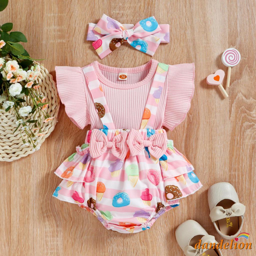 Conjunto para Bebês Meninas 0-18 Meses Macacão com Suspensório, Laço, Estampa de Donut/Flor e Renda Triangular com Faixa de Cabelo.