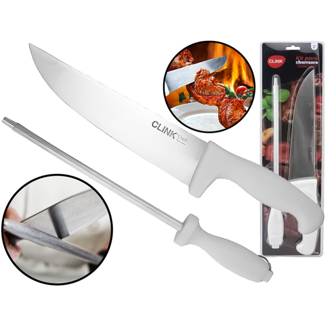 Kit Churrasco Faca e Afiador Clink Composto por uma faca de alta performance e um afiador prático, este kit é ideal para quem valoriza cortes precisos e utensílios duráveis. A faca conta com lâmina em aço inoxidável, garantindo resistência à corrosão e excelente fio de corte. Já o afiador, compacto e fácil de manusear, permite manter a lâmina sempre afiada com segurança e rapidez. Características: > Lâmina em aço inox; > Design prático e funcional; > Ideal para carnes, legumes, frutas e diversos tipos de preparo; > Cabo que proporciona conforto e firmeza no manuseio, mesmo durante longos períodos de uso. Especificações Técnicas: > Material: aço inoxidável; > Dimensões dos produtos (C x L x A): 33cm x 5cm x 2cm. - Marca: Clink - Garantia: 90 dias contra defeitos de fabricação Vantagens de comprar na Brester: - Produto a pronta entrega. - Produto novo, com garantia de fábrica. - Nota fiscal para Pessoa Física e Pessoa Jurídica.
