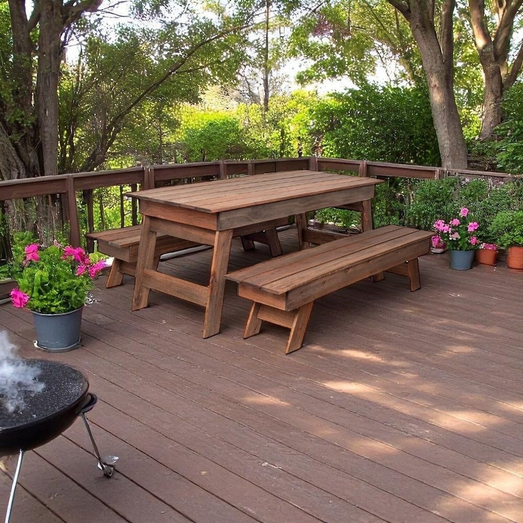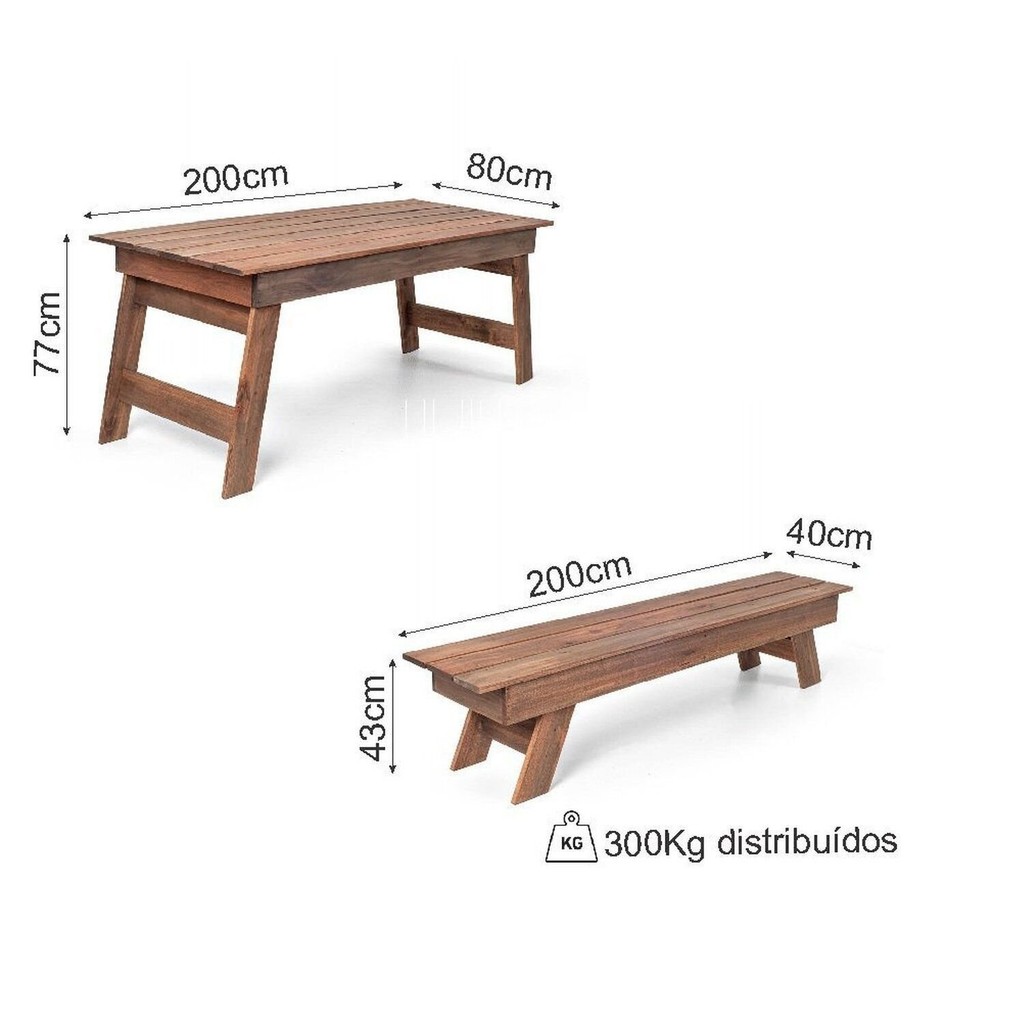 Conjunto Churrasco Mesa e 2 Bancos Gran Rústico Linhas retas e simétricas fazem do conjunto lindas peças que vão deixar sua área de festa, jardim, varanda ou piscina ainda mais especial. Você pode aproveitar os momentos de lazer e quando não estiver usando pode dobrar as pernas da mesa e dos bancos para guardar e otimizar o espaço. O conjunto é construído em madeira maciça de eucalipto, o acabamento Rústico é feito com STAIN na tonalidade Nogueira. Esse tipo de acabamento não forma filme, permitindo que a madeira trabalhe de acordo com as condições climáticas, além de possuir proteção UV e hidrorepelente. Itens inclusos - 1 mesa e 2 bancos Mesa Medidas (cm) - 200 comp. x 80 larg. x 77 alt. Banco Medidas (cm) - 200 comp. x 40 larg. x 43 alt. (banco suporta até 300kg distribuídos) Garantia: 03 Meses Tampo Fixo: Sim Peso da Mesa: 14 Mesa Dobrável: Sim Altura Ajustável: Não Cadeira Estofada: Não Mesa Suporta Até: 40 Serviço Montagem: 114259443 Material do Tampo: Madeira Maciça Origem do Produto: Nacional Possui Travamento: Não Altura do Conjunto: 77 Ambiente Principal: Jardim e Varanda Cadeiras Dobráveis: Sim Material Principal: Madeira Maciça Resistência à Água: Sim Base Antiderrapante: Não Largura do Conjunto: 160 Quantidade de Peças: 3 Peso de Cada Cadeira: 8 Quantidade de Lugares: 3 Material da Base da Mesa: Madeira Maciça Possui Apoio para Braços: Não Possui Suporte para Copo: Não Profundidade do Conjunto: 200 Acompanha Espreguiçadeira: Não Tampa com Orifício Removível: Não Altura das Cadeiras Até o Chão: 43 Informações Complementares (Novo): Por ser um produto rústico produzido 100% de madeira, pode possuir nós, reveses e diferenças na tonalidade de cor das peças, isso é normal e atesta a autenticidade da madeira natural. Como outras madeiras, o eucalipto também reage às condições de uso e Tipo de Madeira Maciça do Tampo: Eucalipto Medidas da Base da Mesa (A x L x P): 77 x 80 x 200 Dimensões de Cada Cadeira (A x L x P): 43 x 40 x 200 Tipo de Madeira Maciça da Base da Mesa: Eucalipto Marca: Viva Ligna Cor do Produto: Nogueira Itens Inclusos: 1 Mesa e 2 Bancos Cor Predominante: Marrom Cada Cadeira Suporta Até: 340 Medida da Mesa (A x L x P): 77 alt. Medida do Tampo (L x C x E): 80 x 200 x 2,2 Medidas da Mesa (A x L x P): 77 x 80 x 200 Medida da Cadeira/Banco (A x L x P): 43 alt.