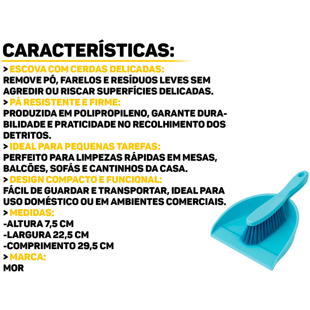 Kit Pá com Escova de Mão Mor O Kit de Limpeza Mor é a solução ideal para manter sua casa, escritório ou qualquer ambiente sempre limpo. Com design ergonômico e compacto, o kit é composto por uma escova com cerdas resistentes que removem a sujeira com facilidade e uma pá que facilita a coleta de resíduos. É leve, fácil de manusear e pode ser guardado em qualquer cantinho, otimizando o espaço. Perfeito para limpezas rápidas do dia a dia! Características: > Ideal para limpezas rápidas, em superfícies como mesas, sofás e balcões; > A pá, toda em plástico, é resistente e firme na hora de recolher os detritos; > Com design compacto, é fácil de guardar e é ideal para realizar as pequenas tarefas do dia a dia; > A escova possui cerdas delicadas, que removem poeira e resíduos sem riscar ou danificar as superfícies. Especificações Técnicas: > Material: polipropileno e cerdas em PET; > Dimensões do produto (C x L x A): 29,5cm x 22,5cm x 7,5cm. - Marca: Mor - Garantia: 90 dias contra defeitos de fabricação Vantagens de comprar na Brester: - Produto a pronta entrega. - Produto novo, com garantia de fábrica. - Nota fiscal para Pessoa Física e Pessoa Jurídica.