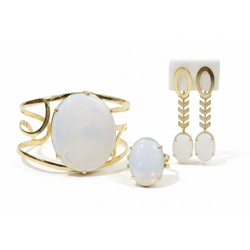 CONJUNTO PEDRA DA LUA OPALINA BRINCOS + ANEL + BRACELETE BANHADOS A OURO 18K SEMIJOIA