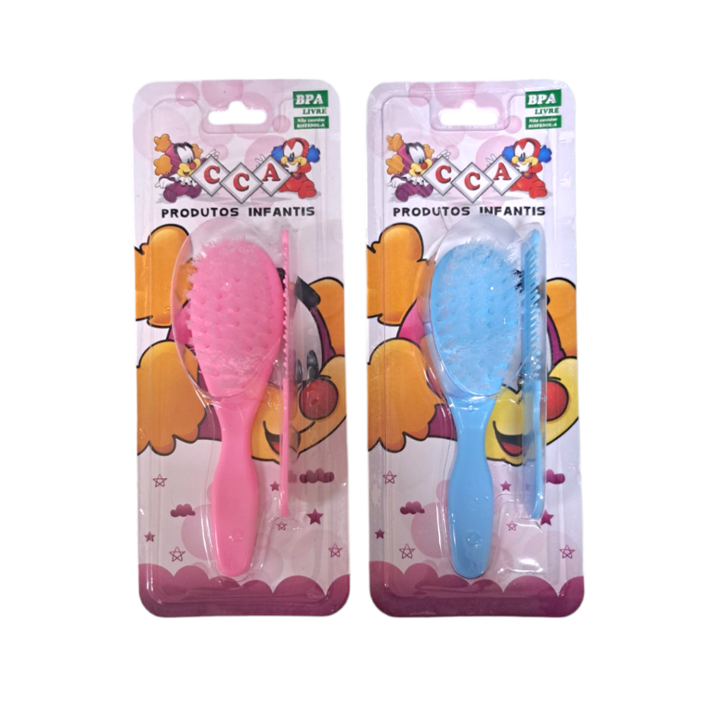 Contém 1 pente e 1 escova de cabelo Composição: polipropileno atóxico, metais, nylon. Escova confeccionada com cerdas de nylon macia e anti alérgica. Pente com bolinhas nas pontas para massagear o coro cabeludo do bebê. DÚVIDAS ENTRE EM CONTATO PELO CHAT