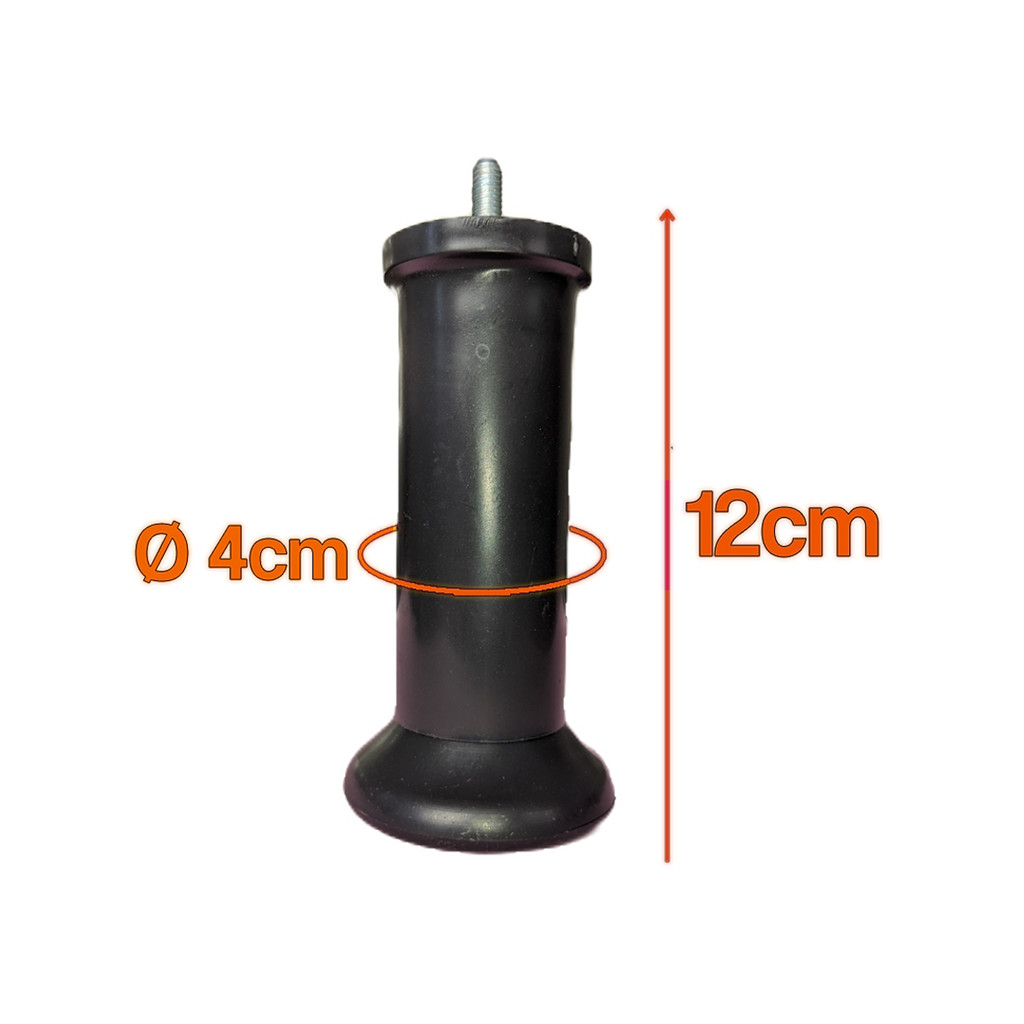 Kit com Pés de Cama Box; Este kit é composto por pés para cama box na cor preta, oferecendo uma solução completa para garantir a estabilidade e durabilidade do seu móvel. Características: Material: Pés de plástico PU, projetados para evitar ruídos e proteger o chão de riscos, muito utilizados em Cama BOX; Fácil Montagem: Pés rosqueáveis que são simples de instalar, com parafuso de rosca padrão (5/16''). Dimensões: Altura dos pés: 12 cm + 2 cm (parafuso) Diâmetro: 4 cm Cor: Preto Este conjunto é ideal para quem busca uma solução prática e resistente para camas box, proporcionando segurança e facilidade na instalação.